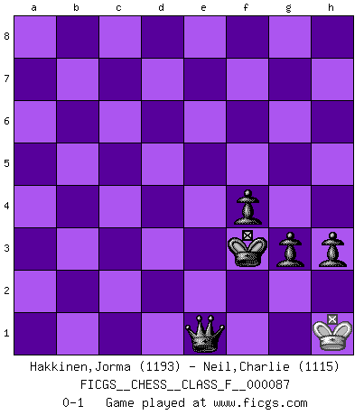 Last move : 0-1 2010 December 21 23:21:59 [Event "FICGS__CHESS__CLASS_F__000087"] [Site "FICGS"] [Date "2010.10.05"] [Round "1"] [White "Hakkinen,Jorma"] [Black "Neil,Charlie"] [Result "0-1"] [WhiteElo "1193"] [BlackElo "1115"] 1.d4 e6 2.c4 Nf6 3.a3 c5 4.Nf3 cxd4 5.Nxd4 Nc6 6.Nc3 Bc5 7.Bg5 Nxd4 8.Bxf6 Qxf6 9.e3 O-O 10.exd4 Bxd4 11.Qf3 d6 12.Qxf6 Bxf6 13.Kd2 b6 14.Bd3 Bb7 15.f3 Rac8 16.b4 Rfd8 17.h4 a6 18.Rhf1 b5 19.Rac1 bxc4 20.Bc2 h6 21.g4 d5 22.Na4 Rc6 23.Nc5 Ba8 24.Ba4 Rb6 25.h5 Bg5+ 26.Kc2 Bxc1 27.Rxc1 e5 28.Re1 f6 29.Kc1 d4 30.Ne4 Bxe4 31.fxe4 c3 32.Rd1 d3 33.Rh1 Rd4 34.Rh2 a5 35.bxa5 Rxa4 36.Rh3 Rxa3 37.Rxd3 Rb2 38.Rxc3 Rxc3+ 39.Kxb2 Rc8 40.Kb3 Kf7 41.Kb4 Rb8+ 42.Ka4 Ke7 43.a6 Kd6 44.Ka5 Kc5 45.a7 Ra8 46.Ka6 Rxa7+ 47.Kxa7 Kd4 48.Kb6 Kxe4 49.Kc5 Kf4 50.Kd5 Kxg4 51.Ke4 Kxh5 52.Kf5 g5 53.Ke4 Kg4 54.Ke3 f5 55.Kf2 h5 56.Kg2 h4 57.Kh2 Kf3 58.Kg1 g4 59.Kh2 f4 60.Kg1 e4 61.Kf1 h3 62.Kg1 g3 63.Kh1 e3 64.Kg1 e2 65.Kh1 e1Q+ 0-1 Queen's pawn Kingside Castling by player Black (move 9) 10 pieces endgame at move 46 : White KPPP , Black KRPPPP WHITE : King + 3 Pawns BLACK : King + 1 Rook 4 Pawns 9 pieces endgame at move 47 : White KPPP , Black KPPPP WHITE : King + 3 Pawns BLACK : King + 4 Pawns 8 pieces endgame at move 48 : White KPP , Black KPPPP WHITE : King + 2 Pawns BLACK : King + 4 Pawns 7 pieces endgame at move 50 : White KP , Black KPPPP WHITE : King + 1 Pawn BLACK : King + 4 Pawns 6 pieces endgame at move 51 : White K , Black KPPPP WHITE : King + BLACK : King + 4 Pawns Promotion Queen by player Black (move 65) Player Black won this chess game. Follow this game move after move (download)The hallmark of the artist is simplicity. (Larry Evans) Ja, jede Frau in Holland liebt mich bestimmt, und alle Männer hassen mich. (Loek van Wely) El Ajedrez es realmente noventa y nueve por ciento calculación. (Soltis) Je fais ceci parce que dans cinquante coups j'obtiendrai cela; je m'appelle Mikhail Moisevitch Botvinnik. (Botvinnik) Whoever said the pen is mightier than the sword obviously never encountered automatic weapons. (US General Douglas MacArthur)