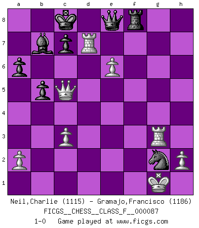 Last move : 1-0 2010 December 16 3:33:57 [Event "FICGS__CHESS__CLASS_F__000087"] [Site "FICGS"] [Date "2010.10.05"] [Round "1"] [White "Neil,Charlie"] [Black "Gramajo,Francisco"] [Result "1-0"] [WhiteElo "1115"] [BlackElo "1186"] 1.c4 Nc6 2.d4 e6 3.e3 d5 4.Nc3 Bb4 5.Bd2 dxc4 6.Bxc4 Nf6 7.Nf3 Bxc3 8.bxc3 O-O 9.O-O h6 10.Bd3 a6 11.e4 b5 12.Re1 Bb7 13.e5 Ne7 14.Rb1 Ned5 15.Qc1 Nd7 16.Bxh6 gxh6 17.Qxh6 f5 18.Ng5 Rf7 19.Nxf7 Kxf7 20.Qh7+ Ke8 21.f4 Nf8 22.Qg7 Nxf4 23.Bxf5 exf5 24.Re3 Nxg2 25.e6 Qe7 26.Rg3 Nxe6 27.Qg8+ Kd7 28.Qg6 Nef4 29.Qxf5+ Ne6 30.d5 Rf8 31.dxe6+ Kd8 32.Rd1+ Kc8 33.Rd7 Qe8 34.Qc5 1-0 English Opening Kingside Castling by player Black (move 8) Kingside Castling by player White (move 9) Player White won this chess game. Follow this game move after move (download)There are two classes of men; those who are content to yield to circumstances and who play whist; those who aim to control circumstances, and who play Chess. (Mortimer Collins) Du musst nicht gut spielen, es reicht, wenn du besser spielst als dein Gegner. (Anonymous) Vive, pierde y aprende al observar a tu oponente como gana. (Amber Steenbock) Soyez une menace à chaque fois que vous vous asseyez pour jouer. (Ken Smith) Life is verb, not a noun. (Charlotte Perkins Gilman)