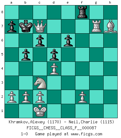 Last move : 1-0 2010 December 26 21:19:24 [Event "FICGS__CHESS__CLASS_F__000087"] [Site "FICGS"] [Date "2010.10.05"] [Round "1"] [White "Khramkov,Alexey"] [Black "Neil,Charlie"] [Result "1-0"] [WhiteElo "1170"] [BlackElo "1115"] 1.d4 e6 2.e4 d5 3.Nc3 Nf6 4.Bg5 Bb4 5.e5 h6 6.Bxf6 gxf6 7.Nf3 fxe5 8.Nxe5 Nd7 9.Nd3 Qg5 10.Nxb4 c6 11.Qf3 Nb6 12.h4 Qe7 13.Nd3 Bd7 14.Nc5 Rb8 15.O-O-O Nc8 16.Bd3 Nd6 17.Nxd7 Qxd7 18.Qf6 Rg8 19.Qxh6 Kd8 20.Rdg1 b5 21.Qf6+ Kc7 22.h5 Ne8 23.Qe5+ Kb7 24.h6 Nd6 25.h7 Rh8 26.g4 Ne8 27.g5 f6 28.gxf6 Rxh7 29.Rxh7 Qxh7 30.Bxh7 Nc7 31.Rg7 Rc8 32.f7 Rf8 33.Qd6 Rh8 34.f8=Q Rxf8 35.Qxc7+ 1-0 Queen's pawn Queenside Castling by player White (move 15) Promotion Queen by player White (move 34) Player White won this chess game. Follow this game move after move (download)No other master has such a terrific will to win. At the board he radiates danger, and even the strongest opponents tend to freeze, like rabbits when they smell a panther. Even his weaknesses are dangerous. As white, his opening game is predictable - you can make plans against it - but so strong that your plans almost never work. In the middle game his precision and invention are fabulous, and in the end game you simply cannot beat him. (Anonymous German Expert) Ein Buch ist ein Spiegel; wenn ein Affe hineinsieht, so kann kein Apostel heraus gucken. (Georg Christoph Lichtenberg) Un jugador que es sorprendido, esta derrotado a medias. (Proverbio) Comme les marins qui ont mille raisons différentes d'aller en mer, les joueurs d'échecs en ont tout autant avant de s'installer devant une table et jouer... (Vincent Bertignac, philosophe) Art is not a thing, it is a way. (Elbert Hubbard)