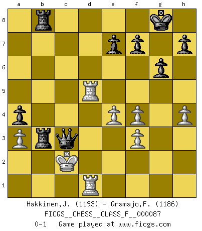 Last move : 0-1 2010 October 31 11:35:17 [Event "FICGS__CHESS__CLASS_F__000087"] [Site "FICGS"] [Date "2010.10.05"] [Round "1"] [White "Hakkinen,Jorma"] [Black "Gramajo,Francisco"] [Result "0-1"] [WhiteElo "1193"] [BlackElo "1186"] 1.d4 g6 2.c4 Bg7 3.Nf3 d5 4.Nc3 c6 5.Bf4 Bg4 6.e3 Nf6 7.cxd5 O-O 8.Bxb8 Rxb8 9.dxc6 bxc6 10.Qc2 Bxf3 11.gxf3 Nd5 12.Bc4 Nb4 13.O-O-O Nxc2 14.Kxc2 Rb4 15.Bb3 Qc7 16.f4 Rfb8 17.h4 a5 18.f3 c5 19.dxc5 Bxc3 20.bxc3 Qxc5 21.Rd5 Qc6 22.Rhd1 a4 23.a3 Rxb3 24.e4 Qxc3+ 0-1 Modern defense Kingside Castling by player Black (move 7) Queenside Castling by player White (move 13) Player Black won this chess game. Follow this game move after move (download)In a gambit you give up a Pawn for the sake of getting a lost game. (Samuel Standige Boden) Es ist wirklich schade, dass so viele Schachspieler nicht auf ihr Äußeres achten! (Alexandra Kosteniuk) El Ajedrez es una manera fabulosa para que los niños aprendan a autovalorarse y a autoestimarse. (Saudin Robovic) Aux échecs, les retours au sommet sont rares : les dommages psychologiques consécutifs à une défaite sont trop sévères. (Daily Telegraph) The leaves of memory seemed to make a mournful rustling in the dark. (Henry Wadsworth Longfellow)