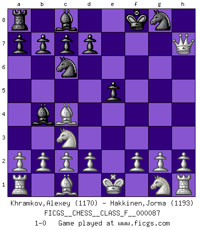 Last move : 1-0 2010 October 8 9:11:39 [Event "FICGS__CHESS__CLASS_F__000087"] [Site "FICGS"] [Date "2010.10.05"] [Round "1"] [White "Khramkov,Alexey"] [Black "Hakkinen,Jorma"] [Result "1-0"] [WhiteElo "1170"] [BlackElo "1193"] 1.e4 e5 2.Nc3 f5 3.exf5 Nc6 4.Qh5+ g6 5.fxg6 Qe7 6.g7+ Qf7 7.Qxf7+ Kxf7 8.gxh8=Q Bb4 9.Qxh7+ Kf8 10.Bc4 1-0 Vienna game Promotion Queen by player White (move 8) Player White won this chess game. Follow this game move after move (download)That's what Chess is all about. One day you give your opponent a lesson, the next day he gives you one. (Bobby Fischer) Jede Eröffnung ist gut genug um gespielt zu werden, wenn nur ihr Ruf schlecht genug ist. (Savielly Grigorievitsch Tartakower) En el Ajedrez, cuando menos, el valiente hereda la tierra. (Edmar Mednis) RxDa4 pat (...) In theory there is no difference between theory and practice. In practice there is. (Yogi Berra)