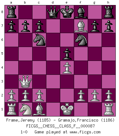 Last move : 1-0 2010 October 15 23:15:20 [Event "FICGS__CHESS__CLASS_F__000087"] [Site "FICGS"] [Date "2010.10.05"] [Round "1"] [White "Frame,Jeremy"] [Black "Gramajo,Francisco"] [Result "1-0"] [WhiteElo "1185"] [BlackElo "1186"] 1.e4 e5 2.Nf3 d6 3.d4 Bg4 4.dxe5 Bxf3 5.Qxf3 dxe5 6.Bc4 Nf6 7.Qb3 Nc6 8.Bxf7+ 1-0 Philidor's defense Player White won this chess game. Follow this game move after move (download)Only the player with the initiative has the right to attack. (Wilhelm Steinitz) Der Bart als Geschlechtszeichen mitten im Gesicht ist obszön. Daher gefällt er den Weibern. [Zugegeben, kein Schachzitat, aber unglaublich originell] (Arthur Schopenhauer) Con el tiempo, empecé a progresar en partidas decisivas. Tal vez porque me di cuenta de una simple verdad: no solo estaba yo nervioso sino también mi oponente. (Mikhail Tal) Même un GMI sait rarement calculer sur plus de cinq coups une attaque à sacrifices. (Rudolf Spielmann) Luck is when opportunity knocks and you answer. (Anonymous)