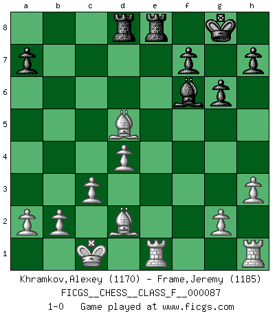 Last move : 1-0 2010 November 2 16:21:49 [Event "FICGS__CHESS__CLASS_F__000087"] [Site "FICGS"] [Date "2010.10.05"] [Round "1"] [White "Khramkov,Alexey"] [Black "Frame,Jeremy"] [Result "1-0"] [WhiteElo "1170"] [BlackElo "1185"] 1.e4 e5 2.Nc3 Nf6 3.f4 d6 4.Nf3 Bg4 5.d3 Be7 6.h3 Bxf3 7.Qxf3 Nbd7 8.Be3 c6 9.O-O-O d5 10.exd5 cxd5 11.Nxd5 Nxd5 12.Qxd5 exf4 13.Bxf4 O-O 14.Qxb7 Nf6 15.d4 Nd5 16.Bd2 Nb6 17.Bd3 Bf6 18.Qe4 g6 19.c3 Qd5 20.Qxd5 Nxd5 21.Rde1 Rfe8 22.Be4 Rad8 23.Bxd5 1-0 Vienna : Falkbeer variation Queenside Castling by player White (move 9) Kingside Castling by player Black (move 13) Player White won this chess game. Follow this game move after move (download)I have always a slight feeling of pity for the man who has no knowledge of Chess. (Siegbert Tarrasch) Herr Iljumschinow ist ein etwas merkwürdiger Geschäftsmann: Er arbeitet zusammen mit Leuten wie Muammar al-Gaddafi; früher ist das Saddam Hussein gewesen. (Joel Lautier) El Ajedrez por encima de todo... ¡es una pelea!. (Emanuel Lasker) Un footballeur joue avec ses pieds, parfois avec sa tête. Un joueur d'échecs ne joue qu'avec sa tête. Et quand il ne joue plus, il meurt. (Jacob Murray) The best weapon against an enemy is another enemy. (Friedrich Nietzsche)