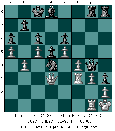 Last move : 0-1 2010 December 11 3:26:1 [Event "FICGS__CHESS__CLASS_F__000087"] [Site "FICGS"] [Date "2010.10.05"] [Round "1"] [White "Gramajo,Francisco"] [Black "Khramkov,Alexey"] [Result "0-1"] [WhiteElo "1186"] [BlackElo "1170"] 1.e4 c6 2.Nf3 d5 3.e5 Qc7 4.d4 f5 5.Bf4 h6 6.Qd2 g5 7.Be3 f4 8.Bxf4 gxf4 9.Qxf4 Be6 10.Nh4 Bf7 11.Nd2 e6 12.Bd3 Be7 13.O-O Bg5 14.Qg4 Bxd2 15.Ng6 Bxg6 16.Qxg6+ Qf7 17.Qg3 Ne7 18.f4 Ba5 19.Rf3 Nd7 20.c3 O-O-O 21.b4 Bc7 22.a4 Rdg8 23.Qf2 Nf5 24.Bxf5 Qxf5 25.c4 h5 26.c5 h4 27.a5 h3 28.g3 a6 29.Rf1 Nf8 30.Qe2 Ng6 31.Kh1 Ne7 32.Rg1 Qg4 33.Rgf1 Nf5 34.Qd3 Bd8 35.Rg1 Nxd4 0-1 Caro-Kann defense Kingside Castling by player White (move 13) Queenside Castling by player Black (move 20) Player Black won this chess game. Follow this game move after move (download)A sacrifice is best refuted by accepting it. (Wilhelm Steinitz) Modernes Schach sorgt sich zuviel um Dinge wie Bauernstruktur usw. Vergessen Sie das, Schachmatt beendet das Spiel! (Nigel Short) Cuando tengo las piezas blancas, yo gano porque soy blanco; Cuando tengo las piezas negras, yo gano porque soy Bogolyubov. (Bogolyubov) Il vaut toujours mieux jouer un plan faux de façon logique que de n'avoir pas de plan du tout. (Victor Kortchnoï) When it is a question of money, everybody is of the same religion. (Voltaire)