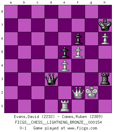 Last move : 0-1 2010 October 5 18:18:7 [Event "FICGS__CHESS__LIGHTNING_BRONZE__000154"] [Site "FICGS"] [Date "2010.10.05"] [Round "1"] [White "Evans,David"] [Black "Comes,Ruben"] [Result "0-1"] [WhiteElo "2232"] [BlackElo "2389"] 1.d4 Nf6 2.c4 e6 3.g3 d5 4.Nf3 c6 5.Bg2 dxc4 6.Ne5 Bb4+ 7.Bd2 Qxd4 8.Bxb4 Qxe5 9.Na3 b5 10.f4 Qc7 11.Nxb5 cxb5 12.Bxa8 Bb7 13.Bxb7 Qxb7 14.O-O Qb6+ 15.Kh1 Nc6 16.Bc3 O-O 17.Bxf6 gxf6 18.e4 Nb4 19.Qg4+ Kh8 20.Rad1 Nd3 21.Rd2 Qc6 22.Qf3 Rd8 23.a3 a5 24.Re2 b4 25.Qh5 Kg7 26.axb4 axb4 27.Qg4+ Kf8 28.Qf3 Ra8 29.Kg2 Ra2 30.Rb1 e5 31.f5 Nc5 32.Qe3 c3 33.bxc3 b3 34.Kg1 Kg7 35.R2e1 Qb5 36.g4 h6 37.h4 Nd3 38.Rxb3 Qxb3 39.Qxd3 Rc2 40.g5 fxg5 41.hxg5 Rxc3 42.gxh6+ Kh7 43.Qe2 Rh3 44.Qf2 f6 45.Kg2 Qd3 0-1 This chess game has been lost on time (started : 2010.10.05 17:2:25) Catalan Opening Kingside Castling by player White (move 14) Kingside Castling by player Black (move 16) Player Black won this chess game. Follow this game move after move (download)Methodical thinking is of more use in Chess than inspiration. (C. J. S. Purdy) Die westlichen Werte sind eine Sprache, welche die Putin-Administration nicht versteht. (Garry Kasparov) Muchos se han convertido en Maestros de Ajedrez, nadie se ha convertido en el Maestro del Ajedrez. (Siegbert Tarrasch) Les échecs sont plus proches de l'art de l'assassinat que de l'art de la guerre. (Arturo Perez-Reverte) Dave, my mind is going. I can feel it. (HAL 9000 in 2001, a space odyssey)