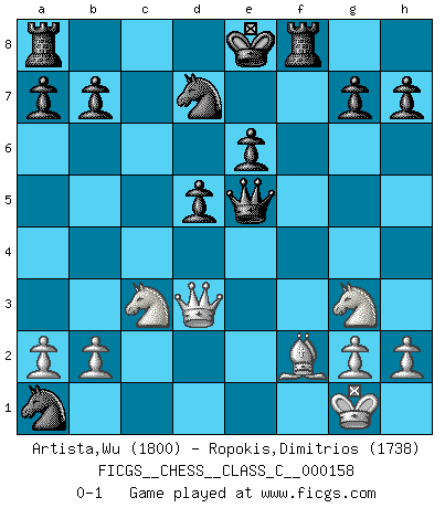 Last move : 0-1 2010 October 19 16:50:43 [Event "FICGS__CHESS__CLASS_C__000158"] [Site "FICGS"] [Date "2010.10.05"] [Round "1"] [White "Artista,Wu"] [Black "Ropokis,Dimitrios"] [Result "0-1"] [WhiteElo "1800"] [BlackElo "1738"] 1.e4 c6 2.d4 d5 3.e5 Bf5 4.Bd3 Bxd3 5.Qxd3 e6 6.Ne2 Ne7 7.Ng3 Nd7 8.f4 Qc7 9.O-O c5 10.c3 Nc6 11.f5 cxd4 12.fxe6 fxe6 13.cxd4 Nxd4 14.Rxf8+ Rxf8 15.Nc3 Qxe5 16.Be3 Nc2 17.Bf2 Nxa1 0-1 Caro-Kann : Advance variation Kingside Castling by player White (move 9) Player Black won this chess game. Follow this game move after move (download)On the chessboard, lies and hypocrisy do not survive long. (Emanuel Lasker) Wir können eben der zündenden Macht des Opfers nicht wiederstehen, denn die Begeisterung für das Opfer liegt in der Natur des Menschen. (Rudolf Spielmann) Yo siempre he tenido un ligero sentimiento de lástima por una persona que no tiene conocimiento del Ajedrez. (Siegbert Tarrasch) Il vaut mieux sacrifier les pièces de l'adversaire. (Xavier Tartacover) He who laughs last probably does not get the joke. (Unknown)