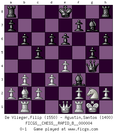 Last move : 0-1 2006 May 21 10:19:44 [Event "FICGS__CHESS__RAPID_B__000004"] [Site "FICGS"] [Date "2006.04.30"] [Round "1"] [White "De Vlieger,Filip"] [Black "Agustin,Santos"] [Result "0-1"] [WhiteElo "1550"] [BlackElo "1400"] 1.e4 c5 2.Nf3 Nc6 3.Bb5 Nf6 4.Nc3 Nd4 5.Bc4 d6 6.O-O Bg4 7.Be2 Nxe2 8.Qxe2 Nd7 9.d3 Ne5 10.Bf4 Nxf3 11.gxf3 Bh5 12.Kh1 h6 13.Nd5 e6 14.Ne3 Qf6 15.Ng2 g5 16.Bc1 Bxf3 17.Qe1 b6 18.Rb1 Bg7 19.b3 Qg6 20.Kg1 Qh5 21.Bb2 Qg4 0-1 Sicilian : Nimzovich-Rossolimo attack (without ...d6) Kingside Castling by player White (move 6) Player Black won this chess game. Follow this game move after move (download)If Chess is a science, it's a most inexact one. If Chess is an art, it is too exacting to be seen as one. If Chess is a sport, it's too esoteric. If Chess is a game, it's too demanding to be just a game. If Chess is a mistress, she's a demanding one. If Chess is a passion, it's a rewarding one. If Chess is life, it's a sad one. (Unknown) Du musst Deinen Gegner in einen tiefen dunklen Wald führen wo 2+2=5 ist und wo der Weg, der wieder hinausführt, nur breit genug für einen ist. (Mikhail Nekhemyevich Tal) El Ajedrez es como la guerra en un tablero. (Bobby Fischer) Assurément je connaissais par expérience le mystérieux attrait de ce jeu royal, le seul entre tous les jeux inventés par les hommes qui échappe souverainement à la tyrannie du hasard, le seul où l'on ne doive sa victoire qu'à son intelligence ou plutôt à une certaine forme d'intelligence. Mais n'est-ce pas déjà le limiter injurieusement que d'appeler les échecs un jeu ? N'est-ce pas une science, un art ou quelque chose qui, comme le cercueil de Mahomet entre ciel et terre, est suspendu entre l'un et l'autre, et qui réunit un nombre incroyable de contraires ? [...] C'est une pensée qui ne mène à rien, une mathématique qui n'établit rien, un art qui ne laisse pas d'uvre, une architecture sans matière; et il l'a prouvé néanmoins qu'il était plus durable, à sa manière, que les livres ou que tout autre monument, ce jeu unique qui appartient à tous les peuples et à tous les temps, et dont personne ne sait quel dieu en fit don à la terre pour tuer l'ennui, pour aiguiser l'esprit et stimuler l'âme. Où commence-t-il, où finit-il ? (Stefan Zweig) You must do what you feel is right... of course. (Obi-Wan Kenobi in Star Wars ep.4)