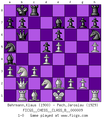 Last move : 1-0 2007 February 20 22:4:46 [Event "FICGS__CHESS__CLASS_B__000009"] [Site "FICGS"] [Date "2006.11.25"] [Round "1"] [White "Behrmann,Klaus"] [Black "Pech,Jaroslav"] [Result "1-0"] [WhiteElo "1900"] [BlackElo "1929"] 1.e4 e6 2.d4 d5 3.e5 c5 4.c3 Nc6 5.Nf3 Qb6 6.a3 c4 7.Nbd2 Na5 8.h4 Bd7 9.Be2 Be7 10.Rb1 Nh6 11.h5 O-O-O 12.Qc2 Kb8 13.b3 cxb3 14.Nxb3 Ba4 15.Nfd2 Rc8 16.Qb2 1-0 French : Advance, Paulsen attack Queenside Castling by player Black (move 11) Player White won this chess game. Follow this game move after move (download)Fischer is under obligation to nobody. (Joseph Platz) Man gibt nur Pakete auf. (Paul Keres) No es una movida, aún la mejor movida que tu debas buscar, sino un plan comprensible. (Eugene Znosko-Borovsky) Fischer est le meilleur joueur du monde et Karpov n'est qu'un joueur de bistrot. (Garry Kasparov, agé de 16 ans) The Internet isn't free. It just has an economy that makes no sense to capitalism. (Brad Shapcott)
