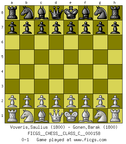 Last move : 0-1 2010 November 14 22:8:28 [Event "FICGS__CHESS__CLASS_C__000158"] [Site "FICGS"] [Date "2010.10.05"] [Round "1"] [White "Voveris,Saulius"] [Black "Gonen,Barak"] [Result "0-1"] [WhiteElo "1800"] [BlackElo "1800"] 0-1 This chess game has been lost on time (started : 2010.10.05 22:28:50) Player Black won this chess game. Follow this game move after move (download)It's just you and your opponent at the board and you're trying to prove something. (Bobby Fischer) Die Leute spielen gegen mich seit 15 Jahren unter Ihren Möglichkeiten. (Robert James Fischer) El juego de Fischer siempre fue nítido, racional y brillante. Uno de los mejores por siempre. (Dave Regis) Il s'avisa de me proposer d'apprendre les échecs qu'il jouait un peu... me voilà forcené des échecs. J'achète un échiquier, je m'enferme dans ma chambre, j'y passe des jours et des nuits à vouloir apprendre par cur toutes les parties. (Jean-Jacques Rousseau, Confessions) It's not the size of the dog in the fight, it's the size of the fight in the dog. (Mark Twain)