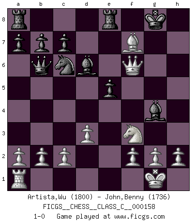Last move : 1-0 2010 December 27 16:35:4 [Event "FICGS__CHESS__CLASS_C__000158"] [Site "FICGS"] [Date "2010.10.05"] [Round "1"] [White "Artista,Wu"] [Black "John,Benny"] [Result "1-0"] [WhiteElo "1800"] [BlackElo "1736"] 1.e4 e5 2.Nf3 d5 3.exd5 Qxd5 4.Nc3 Qa5 5.Bc4 Bd6 6.O-O Nf6 7.Re1 O-O 8.d3 h6 9.Bd2 Qb6 10.Qc1 Re8 11.Ne4 Nxe4 12.Rxe4 Nc6 13.Bxh6 gxh6 14.Qxh6 Be6 15.Rg4+ Bxg4 16.Qg6+ Kh8 17.Qf6+ Kg8 18.Bxf7+ 1-0 QP counter-gambit (elephant gambit) Kingside Castling by player White (move 6) Kingside Castling by player Black (move 7) Player White won this chess game. Follow this game move after move (download)Chess, like any creative activity, can exist only through the combined efforts of those who have creative talent, and those who have the ability to organize their creative work. (Mikhail Botvinnik) Wenn du nicht weißt was du tun sollst, warte bis dein Gegner eine Idee hat. Sie wird sicher schlecht sein. (Siegbert Tarrasch) Los Peones son nacidos libres, y aún así, se encuentran por doquier encadenados. (Rick Kennedy) Les échecs, c'est la lutte contre l'erreur. (Johannes Zukertort) The Movers & Shakers of this world are those who play chess in the mornings and go to the disco in the evenings. (Dinesh De Silva)