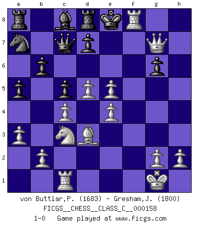 Last move : 1-0 2010 November 14 11:52:58 [Event "FICGS__CHESS__CLASS_C__000158"] [Site "FICGS"] [Date "2010.10.05"] [Round "1"] [White "von Buttlar,Paul"] [Black "Gresham,Jonathan"] [Result "1-0"] [WhiteElo "1683"] [BlackElo "1800"] 1.c4 h6 2.Nc3 e6 3.e4 Nc6 4.d4 Bb4 5.Be3 a5 6.Bd3 Nge7 7.Nge2 O-O 8.O-O b6 9.Rc1 e5 10.d5 Na7 11.a3 Bd6 12.Qd2 c5 13.Ng3 Ng6 14.Nf5 Qc7 15.Bxh6 Be7 16.Bxg7 Rd8 17.Qh6 Bd6 18.Nh4 Bf8 19.Nxg6 fxg6 20.Qh8+ Kf7 21.f4 Bxg7 22.fxe5 Ke7 23.Qxg7+ Ke8 24.Rf8+ 1-0 English Opening Kingside Castling by player Black (move 7) Kingside Castling by player White (move 8) Player White won this chess game. Follow this game move after move (download)Via the squares on the chessboard, the Indians explain the movement of time and the age, the higher influences which control the world and the ties which link Chess with the human soul. (Al-Masudi) Es ist besser die Steine des Gegners zu opfern. (Savielly Grigorievitsch Tartakower) Las combinaciones han sido siempre el aspecto más intrigante del Ajedrez. Los Maestros las buscan, el público las aplauden, los críticos las alaban. La razón se debe a que las combinaciones hacen posible que el Ajedrez sea más que un ejercicio matemático con una carencia de vida. Ellas son la poesía del juego, son del Ajedrez lo que la melodía es de la música. Ellas representan el triunfo de la mente sobre la materia. (Reuben Fine) Ce qui caractérise les parties de combat, c'est que si le défenseur a constamment de difficiles problèmes à résoudre, l'attaquant doit chercher sans relâche de nouvelles possibilités d'attaque. (Koblentz) There is a very easy way to return from a casino with a small fortune : go there with a large one. (Jack Yelton)