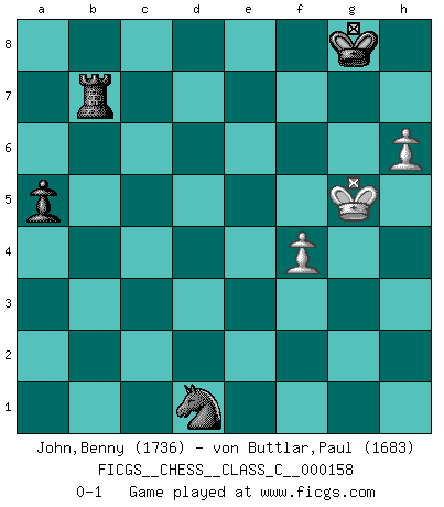 Last move : 0-1 2011 June 5 19:8:19 [Event "FICGS__CHESS__CLASS_C__000158"] [Site "FICGS"] [Date "2010.10.05"] [Round "1"] [White "John,Benny"] [Black "von Buttlar,Paul"] [Result "0-1"] [WhiteElo "1736"] [BlackElo "1683"] 1.e4 e6 2.Bc4 d5 3.exd5 exd5 4.Bb3 c6 5.d4 Bd6 6.Nf3 Ne7 7.O-O O-O 8.c4 dxc4 9.Bxc4 Bf5 10.Nc3 Nd7 11.h3 Nb6 12.Bb3 Ned5 13.Nxd5 cxd5 14.Re1 Rc8 15.Ne5 Bb8 16.Qf3 g6 17.Bh6 Re8 18.Nxf7 Kxf7 19.g4 Qh4 20.Be3 Qf6 21.gxf5 Qxf5 22.Qxf5+ gxf5 23.Kh1 Re4 24.Bg5 Rce8 25.Rxe4 Rxe4 26.Rg1 Bf4 27.Bxf4 Rxf4 28.Kg2 Rxd4 29.Rc1 Nc4 30.Ba4 Ke6 31.b3 Nd6 32.Kg3 b5 33.Rc7 bxa4 34.Rxh7 axb3 35.axb3 Nf7 36.Rg7 Rd3+ 37.Kh4 Rxb3 38.Rg6+ Ke7 39.Ra6 Rb7 40.Kh5 d4 41.Kg6 d3 42.Kxf5 d2 43.Ra1 Nd6+ 44.Kf4 Nc4 45.h4 Nb2 46.h5 d1Q 47.Rxd1 Nxd1 48.h6 Kf7 49.Kg5 Kg8 50.f4 a5 0-1 French defense Kingside Castling by player White (move 7) Kingside Castling by player Black (move 7) 10 pieces endgame at move 37 : White KRPP , Black KRNPPP WHITE : King + 1 Rook 2 Pawns BLACK : King + 1 Rook 1 Knight 3 Pawns 9 pieces endgame at move 42 : White KRPP , Black KRNPP WHITE : King + 1 Rook 2 Pawns BLACK : King + 1 Rook 1 Knight 2 Pawns Promotion Queen by player Black (move 46) 8 pieces endgame at move 47 : White KRPP , Black KRNP WHITE : King + 1 Rook 2 Pawns BLACK : King + 1 Rook 1 Knight 1 Pawn 7 pieces endgame at move 47 : White KPP , Black KRNP WHITE : King + 2 Pawns BLACK : King + 1 Rook 1 Knight 1 Pawn Player Black won this chess game. Follow this game move after move (download)Do you realize Fischer almost never has any bad pieces? He exchanges them, and the bad pieces remain with his opponents. (Yuri Balashov) Obwohl ich alt bin, darf mir niemand den Finger in den Mund stecken, sonst beisse ich. (Wilhelm Steinitz) Todavía soy una víctima del Ajedrez. Tiene toda la belleza del arte y mucho mas. No puede ser comercializado. El Ajedrez es mas puro que el arte en su posición social. (Marcel Duchamp) Les Cavaliers se révèlent fort utiles dans les positions fermées. D'habitude, les Fous sont un peu plus forts que les Cavaliers dans les positions ouvertes. Qu'on le veuille ou non, il restera toujours des exceptions ! Heh, heh, heh. Time to abandon ship. (General Grievous in Star Wars ep.3)