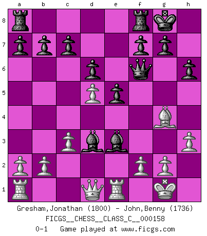 Last move : 0-1 2011 February 19 10:45:58 [Event "FICGS__CHESS__CLASS_C__000158"] [Site "FICGS"] [Date "2010.10.05"] [Round "1"] [White "Gresham,Jonathan"] [Black "John,Benny"] [Result "0-1"] [WhiteElo "1800"] [BlackElo "1736"] 1.h3 e5 2.e4 Bc5 3.Nc3 Nf6 4.Nf3 d6 5.d3 h6 6.Bd2 O-O 7.Be2 Nc6 8.O-O Nd4 9.Nd5 Nxd5 10.exd5 Bf5 11.Nxd4 Bxd4 12.c3 Bb6 13.Bg4 Bxd3 14.Re1 Qf6 15.Be3 Bxe3 0-1 This chess game has been lost on time (started : 2010.10.05 22:28:50) Clemenz (Mead's, Basman's or de Klerk's) Opening Kingside Castling by player Black (move 6) Kingside Castling by player White (move 8) Player Black won this chess game. Follow this game move after move (download)The battle for the ultimate truth will never be won. And that's why Chess is so fascinating. (Hans Kmoch) Ich verstehe mehr vom Schach als irgendein anderer lebender Meister. (José Raúl Capablanca) El Ajedrez, como la música, como el amor, tiene el poder de hacer feliz a la gente. (Siegbert Tarrasch) Botvinnik disait en comparant les échecs à la musique: Il existe une science dont le but est l'étude de l'acoustique et des sons. Mais il y a aussi un art qui se sert de l'océan des sons : c'est la musique. De toute évidence, il en est de même pour la pensée. La logique est l'étude des lois de la réflexion et les échecs reflètent, en tant qu'art, le côté logique de la réflexion, sous la forme d'images artistiques... Extrait de Fischer - Spassky, Reykjavik 1972 par Alexander & F. Wyndham (Ed. Solar), p 37. There are three kinds of lies: lies, damned lies and statistics. (Mark Twain)