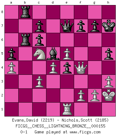 Last move : 0-1 2010 October 6 16:51:24 [Event "FICGS__CHESS__LIGHTNING_BRONZE__000155"] [Site "FICGS"] [Date "2010.10.06"] [Round "1"] [White "Evans,David"] [Black "Nichols,Scott"] [Result "0-1"] [WhiteElo "2219"] [BlackElo "2185"] 1.e4 e5 2.Nf3 Nc6 3.Bb5 a6 4.Ba4 Nf6 5.O-O Be7 6.Re1 d6 7.c3 O-O 8.h3 Bd7 9.d4 exd4 10.cxd4 d5 11.e5 Ne4 12.Nc3 Nxc3 13.bxc3 Bf5 14.Bxc6 bxc6 15.Qa4 Qd7 16.Ba3 Bxa3 17.Qxa3 Rfb8 18.Nd2 Rb6 19.Nb3 Rab8 20.Qc1 Qd8 21.Qe3 Be6 22.Qf4 h6 23.Nc5 Qe7 24.Re2 a5 25.Rae1 h5 26.a4 Kh7 27.Re4 dxe4 28.Kh2 Bd5 0-1 Ruy Lopez : Closed, Averbach variation Kingside Castling by player White (move 5) Kingside Castling by player Black (move 7) Player Black won this chess game. Follow this game move after move (download)All I want to do, ever, is just play Chess. (Bobby Fischer) Ich trinke, ich rauche, ich spiele, ich liebe Frauen aber Fernschach ist ein Laster, das ich nicht habe. (Mikhail Nekhemyevich Tal) Coloca el contenido del tablero de Ajedrez en un sombrero, agita las piezas vigorosamente, derrámalas en el tablero desde una altura de medio metro y así obtienes el estilo de Wilhelm Steinitz. (H. E. Bird) Je crois qu'il existe des manières très spécifiques de jouer efficacement contre une machine. Evidemment, nous n'avons aucune chance en technique pure, parce que l'ordinateur calcule de manière parfaite. Mais lorsque nous faisons appel à notre cerveau, en utilisant l'intuition et la compréhension, alors nous restons beaucoup plus forts. (Anatoli Karpov) Depression is just anger without enthusiasm. (Unknown)
