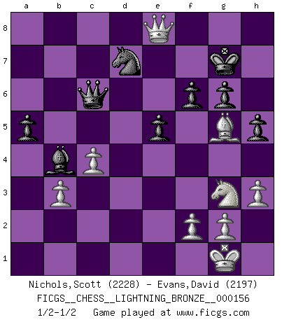 Last move : 1/2-1/2 2010 October 6 17:52:8 [Event "FICGS__CHESS__LIGHTNING_BRONZE__000156"] [Site "FICGS"] [Date "2010.10.06"] [Round "1"] [White "Nichols,Scott"] [Black "Evans,David"] [Result "1/2-1/2"] [WhiteElo "2228"] [BlackElo "2197"] 1.e4 c5 2.Nf3 d6 3.d4 cxd4 4.Nxd4 Nf6 5.Nc3 a6 6.Be2 e5 7.Nb3 Be7 8.O-O O-O 9.Be3 Be6 10.Qd2 Nbd7 11.a4 Rc8 12.a5 Qc7 13.Rfc1 Qc6 14.Bf3 Bc4 15.Qd1 Rfe8 16.Nd2 Be6 17.Nf1 Qc7 18.Ng3 b6 19.axb6 Nxb6 20.b3 Qxc3 21.Bxb6 Qc6 22.Be3 d5 23.exd5 Bxd5 24.c4 Bxf3 25.Qxf3 g6 26.Rd1 Kg7 27.Qe2 Rb8 28.Rab1 Bc5 29.Qd2 Bb4 30.Qc2 h6 31.h3 Rbd8 32.Rxd8 Rxd8 33.Rd1 Rxd1+ 34.Qxd1 a5 35.Qd8 h5 36.Bg5 Nd7 37.Qe8 f6 1/2-1/2 Sicilian : Najdorf, Opovcensky variation Kingside Castling by player White (move 8) Kingside Castling by player Black (move 8) This chess game ended in a draw. Follow this game move after move (download)The laws of Chess do not permit a free choice: you have to move whether you like it or not. (Emanuel Lasker) Schach ist ein schwarz-weisser Dschungel. (Garry Kasparov) Hay dos clases de hombres: aquellos que se conforman en dejarse llevar por las circunstancias y que juegan barajas y aquellos decididos a controlar las circunstancias y que juegan al Ajedrez. (Mortimer Collins) Je ne suis pas le dernier à jouer lâchement des coups douteux pendant le zeïtnot de l'adversaire pour l'achever: en effet les coups qui font le plus peur sont ceux que l'on ne comprend pas. Je me fais souvent peur quand je joue. (Un professeur anonyme) Winning isn't everything... but losing is nothing. (Mednis)
