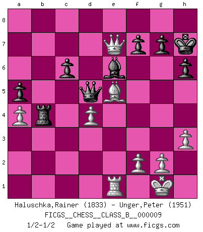 Last move : 1/2-1/2 2007 February 8 15:44:9 [Event "FICGS__CHESS__CLASS_B__000009"] [Site "FICGS"] [Date "2006.11.25"] [Round "1"] [White "Haluschka,Rainer"] [Black "Unger,Peter"] [Result "1/2-1/2"] [WhiteElo "1833"] [BlackElo "1951"] 1.d4 Nf6 2.c4 e6 3.Nc3 Bb4 4.e3 O-O 5.Bd3 d5 6.Nf3 c5 7.O-O Nc6 8.a3 Bxc3 9.bxc3 dxc4 10.Bxc4 Qc7 11.Bd3 e5 12.Qc2 Re8 13.Ng5 h6 14.Ne4 Nxe4 15.Bxe4 exd4 16.cxd4 cxd4 17.exd4 Qe7 18.Bxc6 bxc6 19.Be3 Bd7 20.Rfb1 Rab8 21.Rxb8 Rxb8 22.Bf4 Rb6 23.h3 Be6 24.a4 Qd7 25.Re1 Rb4 26.Be5 a5 27.Qc5 Qd5 28.Qe7 Kh7 1/2-1/2 Nimzo-Indian : 4.e3 O-O, 5.Bd3 d5 Kingside Castling by player Black (move 4) Kingside Castling by player White (move 7) This chess game ended in a draw. Follow this game move after move (download)What is the difference between chess and football? Everybody understands football, but nobody plays it. Everybody plays chess, but nobody understands it. Everything is relative. (Vladimir Kramnik) Der Freibauer hat für mich eine Seele, genau wie der Mensch, Wünsche, die unerkannt in ihm schlummern, und Befürchtungen, von deren Existenz er selbst kaum ahnt. (Aaron Nimzowitsch) El Ajedrez es parte de la cultura, y si una cultura esta en decadencia, entonces también el Ajedrez declinará. (Mikhail Botvinnik) Aidez vos pièces, elles vous aideront. (Paul Morphy) I've never seen so many men wasted so badly. (Blondie in The Good, The Bad and The Ugly)