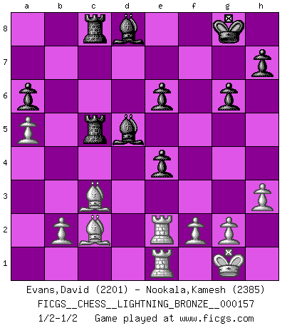 Last move : 1/2-1/2 2010 October 6 21:4:46 [Event "FICGS__CHESS__LIGHTNING_BRONZE__000157"] [Site "FICGS"] [Date "2010.10.06"] [Round "1"] [White "Evans,David"] [Black "Nookala,Kamesh"] [Result "1/2-1/2"] [WhiteElo "2201"] [BlackElo "2385"] 1.e4 e5 2.Nf3 Nc6 3.Bb5 a6 4.Ba4 Be7 5.O-O Nf6 6.Re1 b5 7.Bb3 d6 8.c3 O-O 9.h3 Nb8 10.d4 Nbd7 11.Nbd2 Bb7 12.Bc2 c5 13.Nf1 exd4 14.cxd4 cxd4 15.Nxd4 g6 16.a4 b4 17.Ng3 Nc5 18.a5 Re8 19.Bd2 d5 20.e5 Nfe4 21.e6 fxe6 22.Nxe4 dxe4 23.Bxb4 Qd5 24.Bc3 Bf6 25.Ne2 Bg5 26.Qd4 Qxd4 27.Nxd4 Rac8 28.Nb3 Nxb3 29.Bxb3 Bd5 30.Ba4 Re7 31.Re2 Rec7 32.Rae1 Rc5 33.Bc2 Bd8 1/2-1/2 Ruy Lopez Kingside Castling by player White (move 5) Kingside Castling by player Black (move 8) This chess game ended in a draw. Follow this game move after move (download)Chess is like war on a board. (Bobby Fischer) Es gibt nur zwei wahre Schachgenies - das andere war Wilhelm Steinitz, der Weltmeister von 1872 bis 1894. (Robert James Fischer) Hasta este punto, las blancas han seguido un análisis bien conocido. Pero ahora el hace un error fatal: empieza a usar su propia cabeza. (Siegbert Tarrasch) Horreur, mais aussi harmonie suprême : qu'y avait-il en effet au monde en dehors des échecs ? Le brouillard, l'inconnu, le non-être... (Vladimir Nabokov) The real voyage of discovery consists not in seeking new lands but in seeing with new eyes. (Marcel Proust)