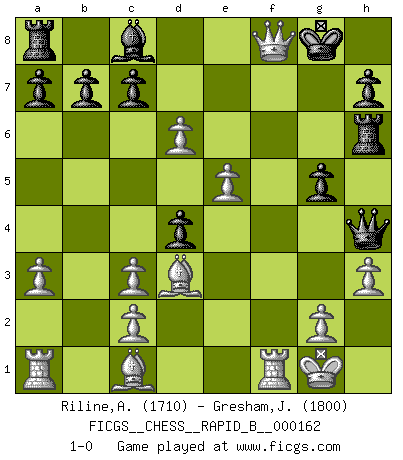 Last move : 1-0 2010 October 16 6:3:55 [Event "FICGS__CHESS__RAPID_B__000162"] [Site "FICGS"] [Date "2010.10.08"] [Round "1"] [White "Riline,Alejandro"] [Black "Gresham,Jonathan"] [Result "1-0"] [WhiteElo "1710"] [BlackElo "1800"] 1.e4 e6 2.d4 d5 3.Nc3 Bb4 4.a3 Bxc3+ 5.bxc3 Ne7 6.e5 Nbc6 7.f4 O-O 8.Nf3 f5 9.exf6 Rxf6 10.Bd3 Nf5 11.O-O Nd6 12.Ne5 Nxe5 13.dxe5 Rh6 14.exd6 Qh4 15.h3 e5 16.fxe5 g5 17.Qf3 d4 18.Qf8+ 1-0 French : Winawer (Nimzovich) variation Kingside Castling by player Black (move 7) Kingside Castling by player White (move 11) Player White won this chess game. Follow this game move after move (download)An attack on the wing should be met by play in the center. (Nimzovitch) Ich bewundere Kasparows phantasievolle Angriffssiege aus den Achtzigern und Neunzigern, aber wenn man sie mit dem Computer überprüft, nimmt der Computer in jeder zweiten Partie die Opfer an, verteidigt sich und gewinnt. (Vladimir Kramnik) Repentinamente, me resultaba obvio en mi analisis que yo había pasado por alto lo que Fischer había visto en el tablero con la mas grande facilidad. (Mikhail Botvinnik) Les Echecs sont affaire de jugement sensible. Savoir quand frapper et quand esquiver. (Fischer) My poor ole parrot... Is not in the circulation of displays ....poo hoo hoo :) (Wayne Lowrance's enigma)