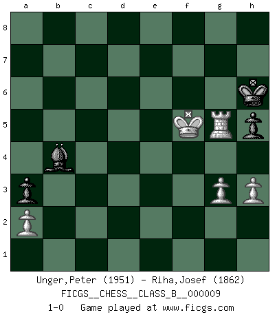 Last move : 1-0 2006 November 30 13:51:4 [Event "FICGS__CHESS__CLASS_B__000009"] [Site "FICGS"] [Date "2006.11.25"] [Round "1"] [White "Unger,Peter"] [Black "Riha,Josef"] [Result "1-0"] [WhiteElo "1951"] [BlackElo "1862"] 1.d4 Nf6 2.Nf3 g6 3.c4 Bg7 4.Nc3 O-O 5.e4 d6 6.Be2 e5 7.O-O Nc6 8.d5 Ne7 9.b4 Ne8 10.c5 f5 11.Ng5 h6 12.Ne6 Bxe6 13.dxe6 fxe4 14.cxd6 Nxd6 15.b5 Nef5 16.Qd5 Ne7 17.Qb3 Kh7 18.Bg4 Nef5 19.Bxf5 gxf5 20.Ba3 Rg8 21.Rac1 Qe8 22.e7 Qg6 23.Bxd6 cxd6 24.Nd5 Rab8 25.Rc7 a6 26.b6 Kh8 27.Qh3 f4 28.Rd1 Kh7 29.Rd7 a5 30.Nc7 d5 31.Nxd5 Rge8 32.Nc7 e3 33.fxe3 Qxb6 34.Nxe8 Rxe8 35.Qh5 Qg6 36.Qxg6+ Kxg6 37.exf4 Bf6 38.R1d6 exf4 39.Rxb7 Kg7 40.Rd8 Rxe7 41.Rxe7+ Bxe7 42.Rd5 a4 43.Kf2 Kf6 44.h3 Kg6 45.Kf3 a3 46.Kxf4 h5 47.g3 Bb4 48.Rg5+ Kh6 49.Kf5 1-0 King's Indian : East Indian defense Kingside Castling by player Black (move 4) Kingside Castling by player White (move 7) 10 pieces endgame at move 41 : White KRPPP , Black KBPPP WHITE : King + 1 Rook 3 Pawns BLACK : King + 1 Bishop 3 Pawns 9 pieces endgame at move 46 : White KRPPP , Black KBPP WHITE : King + 1 Rook 3 Pawns BLACK : King + 1 Bishop 2 Pawns Player White won this chess game. Follow this game move after move (download)The blunders are all there on the board, waiting to be made. (Savielly Tartakover) Es hat in meinem Leben Zeiten gegeben, in denen das Schachspiel, wenn nicht zum Lebenszweck, so doch zu einem regelrechten Lebensersatz geworden ist. Man fühlt sich in solchen Zeiten nicht so, als besäße man eine göttliche Gabe, sondern eher so, als sei man von ihr besessen. (Garry Kasparov) Si tu oponente no puede hacer nada activo, entonces no apures la posición; En vez de eso, dejalo estar sentado ahí, sufriendo y rogandote por un empate. (Jeremy Silman) Les pièces de l'échiquier étaient impitoyables. Elles le retenaient, elles l'absorbaient. Il y avait de l'horreur en cela, mais aussi une harmonie unique. Car, qu'y a-t-il dans le monde, à part les échecs ? (V. Nabokov) The quality of decision is like the well-timed swoop of a falcon which enables it to strike and destroy its victim. (Sun Tzu)