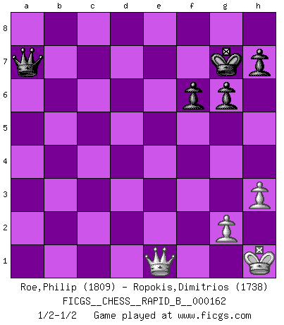 Last move : 1/2-1/2 2010 November 12 4:34:21 [Event "FICGS__CHESS__RAPID_B__000162"] [Site "FICGS"] [Date "2010.10.08"] [Round "1"] [White "Roe,Philip"] [Black "Ropokis,Dimitrios"] [Result "1/2-1/2"] [WhiteElo "1809"] [BlackElo "1738"] 1.Nc3 d5 2.e4 dxe4 3.Nxe4 Bf5 4.Qf3 Bxe4 5.Qxe4 Nf6 6.Qxb7 Nbd7 7.Bb5 Rb8 8.Bxd7+ Nxd7 9.Qxa7 Ra8 10.Qe3 g6 11.d4 Bg7 12.Nf3 O-O 13.O-O Re8 14.Ne5 c5 15.Nxd7 cxd4 16.Qh3 Ra5 17.a4 Rh5 18.Qf3 Qxd7 19.a5 Rb5 20.Ra2 e5 21.b3 e4 22.Qd1 Qd5 23.Bb2 Ra8 24.a6 Rb6 25.c4 Qc5 26.Qa1 Rxb3 27.Re1 e3 28.fxe3 Rxe3 29.Rxe3 dxe3 30.Bxg7 e2 31.Kh1 Qxc4 32.Bc3 e1Q+ 33.Qxe1 Qxa2 34.a7 f6 35.Bd4 Rxa7 36.Bxa7 Qxa7 37.h3 Kg7 1/2-1/2 Dunst (Sleipner, Heinrichsen) Opening Kingside Castling by player Black (move 12) Kingside Castling by player White (move 13) Promotion Queen by player Black (move 32) 10 pieces endgame at move 36 : White KQBPP , Black KQPPP WHITE : King + 1 Queen 1 Bishop 2 Pawns BLACK : King + 1 Queen 3 Pawns 9 pieces endgame at move 36 : White KQPP , Black KQPPP WHITE : King + 1 Queen 2 Pawns BLACK : King + 1 Queen 3 Pawns This chess game ended in a draw. Follow this game move after move (download)The boy (then a 12 year old boy named Anatoly Karpov) doesn't have a clue about Chess, and there's no future at all for him in this profession. (Mikhail Botvinnik) Wenn Du nicht kämpfst, um anderen etwas zu beweisen, sondern nur für Dich selbst, dann bist du fast unbesiegbar. (Garry Kasparov) Si un gobernante no entiende al Ajedrez, ¿como puede governar él un reinado?. (El Rey Khusros II) On n'a jamais que l'âge auquel on a commence à jouer aux échecs car après on cesse de vieillir. (Capablanca) I find television to be very educating. Every time somebody turns on the set, I go in the other room and read a book. (Groucho Marx)