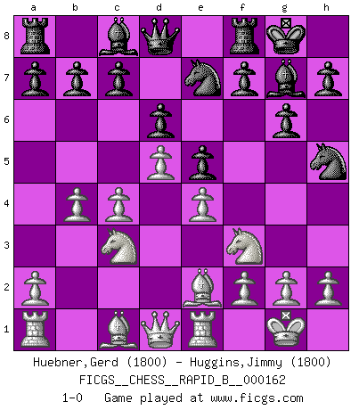 Last move : 1-0 2010 October 16 18:54:46 [Event "FICGS__CHESS__RAPID_B__000162"] [Site "FICGS"] [Date "2010.10.08"] [Round "1"] [White "Huebner,Gerd"] [Black "Huggins,Jimmy"] [Result "1-0"] [WhiteElo "1800"] [BlackElo "1800"] 1.d4 Nf6 2.c4 g6 3.Nc3 Bg7 4.e4 d6 5.Nf3 O-O 6.Be2 e5 7.O-O Nc6 8.d5 Ne7 9.b4 Nh5 10.Re1 1-0 King's Indian : Orthodox, Aronin-Taimanov variation (Yugoslav attack / Mar del Plata variation) Kingside Castling by player Black (move 5) Kingside Castling by player White (move 7) Player White won this chess game. Follow this game move after move (download)You have to have the fighting spirit. You have to force moves and take chances. (Bobby Fischer) Ein Isolani verdüstert die Stimmung auf dem ganzen Schachbrett. (Savielly Grigorievitsch Tartakower) Si tu oponente no puede hacer nada activo, entonces no apures la posición; En vez de eso, dejalo estar sentado ahí, sufriendo y rogandote por un empate. (Jeremy Silman) Botvinnik disait en comparant les échecs à la musique: Il existe une science dont le but est l'étude de l'acoustique et des sons. Mais il y a aussi un art qui se sert de l'océan des sons : c'est la musique. De toute évidence, il en est de même pour la pensée. La logique est l'étude des lois de la réflexion et les échecs reflètent, en tant qu'art, le côté logique de la réflexion, sous la forme d'images artistiques... Extrait de Fischer - Spassky, Reykjavik 1972 par Alexander & F. Wyndham (Ed. Solar), p 37. Whenever people agree with me, I always feel I must be wrong. (Oscar Wilde)