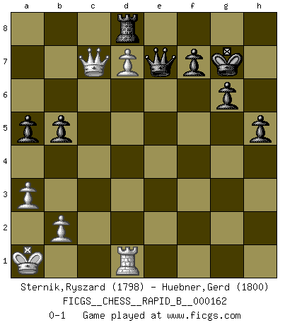 Last move : 0-1 2010 November 5 13:2:43 [Event "FICGS__CHESS__RAPID_B__000162"] [Site "FICGS"] [Date "2010.10.08"] [Round "1"] [White "Sternik,Ryszard"] [Black "Huebner,Gerd"] [Result "0-1"] [WhiteElo "1798"] [BlackElo "1800"] 1.e4 c5 2.Nc3 Nc6 3.Nf3 e6 4.d4 cxd4 5.Nxd4 Qc7 6.f4 Nxd4 7.Qxd4 b6 8.Be3 Bb7 9.Qd3 Bb4 10.Bd2 Nf6 11.Nb5 Bxd2+ 12.Qxd2 Qc6 13.Nd6+ Ke7 14.O-O-O Nxe4 15.Nxe4 Qxe4 16.Qxd7+ Kf6 17.Qd2 Rhd8 18.Bd3 Qa4 19.Kb1 Ke7 20.f5 exf5 21.Qg5+ Kf8 22.Qxf5 g6 23.Qg5 Rd5 24.Qf6 Qd4 25.Qf3 Rad8 26.h4 h5 27.Rhf1 R5d7 28.Qg3 Qg4 29.Qe5 Kg8 30.Rd2 Bd5 31.g3 Bc4 32.R2d1 Rd6 33.Rd2 Bxd3 34.Rxd3 Rxd3 35.cxd3 Qd7 36.Rd1 Re8 37.Qf4 Re2 38.d4 Qc6 39.Qc1 Qe4+ 40.Ka1 Qe3 41.Kb1 Qxg3 42.d5 Qxh4 43.d6 Re8 44.Qc7 Qe4+ 45.Ka1 Qd3 46.Qc1 Qe2 47.d7 Rd8 48.Re1 Qb5 49.Rd1 Kg7 50.Qc7 Qe2 51.Rb1 Qe7 52.Rd1 a5 53.a3 b5 0-1 Sicilian : Closed, 2...Nc6 Queenside Castling by player White (move 14) Player Black won this chess game. Follow this game move after move (download)Chess is a matter of delicate judgment, knowing when to punch and how to duck. (Bobby Fischer) Mein erstes Ziel war nicht, die Partie zu gewinnen, sondern eine Figur zu opfern. -- der junge (Wilhelm Steinitz) El ganar no lo es todo... pero el perder es nada. (Mednis) La vérité est comme le meilleur coup aux échecs : elle existe, mais il faut la chercher. (Arturo Perez-Reverte) Either move or be moved. (Ezra Pound)