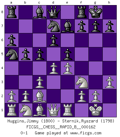 Last move : 0-1 2010 October 16 18:54:57 [Event "FICGS__CHESS__RAPID_B__000162"] [Site "FICGS"] [Date "2010.10.08"] [Round "1"] [White "Huggins,Jimmy"] [Black "Sternik,Ryszard"] [Result "0-1"] [WhiteElo "1800"] [BlackElo "1798"] 1.e4 e5 2.Nf3 Nc6 3.Bb5 a6 4.Ba4 Nf6 5.O-O Be7 6.Re1 b5 7.Bb3 d6 8.c3 O-O 9.h3 Na5 10.Bc2 c5 11.d4 Nd7 0-1 Ruy Lopez : Closed Kingside Castling by player White (move 5) Kingside Castling by player Black (move 8) Player Black won this chess game. Follow this game move after move (download)I give 98 percent of my mental energy to Chess. Others give only 2 percent. (Bobby Fischer) Was ist der Unterschied zwischen einem Strassenarbeiter und einem Schachspieler? --Der Schachspieler bewegt sich ab und zu. (Anonymous) Botvinnik trató de alejar el misterio referente al Ajedrez, siempre relacionandolo a situaciones de la vida diaria. Solía llamar al Ajedrez un problema inexacto típico, similar a aquellos en que la gente tiene siempre que resolver a cada día. (Garry Kasparov) Je ne suis pas le dernier à jouer lâchement des coups douteux pendant le zeïtnot de l'adversaire pour l'achever: en effet les coups qui font le plus peur sont ceux que l'on ne comprend pas. Je me fais souvent peur quand je joue. (Un professeur anonyme) The difference between stupidity and genius is that genius has its limits. (Murphy)
