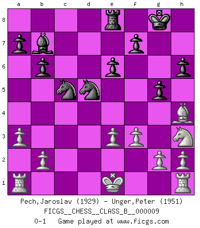 Last move : 0-1 2007 February 15 22:29:16 [Event "FICGS__CHESS__CLASS_B__000009"] [Site "FICGS"] [Date "2006.11.25"] [Round "1"] [White "Pech,Jaroslav"] [Black "Unger,Peter"] [Result "0-1"] [WhiteElo "1929"] [BlackElo "1951"] 1.d4 Nf6 2.c4 e6 3.Nc3 Bb4 4.Qc2 O-O 5.a3 Bxc3+ 6.Qxc3 b6 7.Bg5 Bb7 8.f3 h6 9.Bh4 d5 10.e3 Nbd7 11.Nh3 c5 12.cxd5 Nxd5 13.Bxd8 Nxc3 14.Be7 Rfe8 15.Bh4 Nd5 16.Bb5 g5 17.dxc5 Nxc5 18.Bxe8 Rxe8 0-1 This chess game has been lost on time (started : 2006.11.25 17:11:6) Nimzo-Indian : Classical variation Kingside Castling by player Black (move 4) Player Black won this chess game. Follow this game move after move (download)The passion for playing Chess is one of the most unaccountable in the world. (H.G. Wells) Mein erstes Ziel war nicht, die Partie zu gewinnen, sondern eine Figur zu opfern. -- der junge (Wilhelm Steinitz) El juego del Ajedrez no es solamente una diversión quieta; algunas cualidades muy valuables de la mente se pueden adquirir y cultivar con el, como convertirlos en habitos disponibles para toda ocasión; ya que la vida es algo así como el Ajedrez. (Benjamin Franklin) Le thème de l'attaque double intervient d'une manière ou d'une autre dans l'immense majorité des combinaisons. (Youri Averbakh) Those parts of the system that you can hit with a hammer (not advised) are called hardware; those program instructions that you can only curse at are called software. (Anonymous)