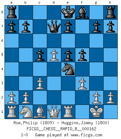 Last move : 1-0 2010 October 16 18:55:7 [Event "FICGS__CHESS__RAPID_B__000162"] [Site "FICGS"] [Date "2010.10.08"] [Round "1"] [White "Roe,Philip"] [Black "Huggins,Jimmy"] [Result "1-0"] [WhiteElo "1809"] [BlackElo "1800"] 1.e4 c5 2.Nf3 d6 3.Bb5+ Bd7 4.Bxd7+ Qxd7 5.O-O Nc6 6.c3 Nf6 7.d4 Nxe4 8.d5 Ne5 9.Nxe5 dxe5 10.Re1 f5 11.f3 1-0 Sicilian : Canal-Sokolsky attack, Bronstein gambit Kingside Castling by player White (move 5) Player White won this chess game. Follow this game move after move (download)White lost because he failed to remember the right continuation and had to think up the moves himself. (Siegbert Tarrasch) Nicht daß Diemer aus Opportunismus Mitglied der NSDAP geworden wäre. Er war ein Fanatiker, in allem, was er tat. (Hans Ree) Los Peones son nacidos libres, y aún así, se encuentran por doquier encadenados. (Rick Kennedy) Aux échecs, l'amour-propre est satisfait quand on remporte la victoire, mais il n'y a pas de honte à être battu. (Benjamin Franklin) Yoga is 99% practice and 1% knowledge. (Sri Krishna Pattabhi Jois)