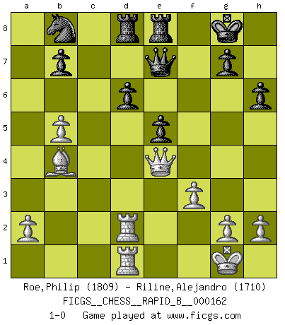 Last move : 1-0 2010 November 21 0:49:8 [Event "FICGS__CHESS__RAPID_B__000162"] [Site "FICGS"] [Date "2010.10.08"] [Round "1"] [White "Roe,Philip"] [Black "Riline,Alejandro"] [Result "1-0"] [WhiteElo "1809"] [BlackElo "1710"] 1.e4 c5 2.Nf3 Nc6 3.d4 cxd4 4.Nxd4 e5 5.Nb5 d6 6.c4 Be7 7.N1c3 a6 8.Na3 Be6 9.Nc2 Nf6 10.Be2 O-O 11.O-O Rc8 12.Qd2 h6 13.b3 Nd7 14.Rd1 f5 15.exf5 Bxf5 16.Nd5 Bg5 17.Nce3 Be6 18.Bb2 Nc5 19.Bf3 Kh8 20.Qe2 Bxe3 21.Qxe3 Qe8 22.Rd2 Rd8 23.Nc7 Qf7 24.Nxe6 Nxe6 25.Bd5 Qf6 26.Rad1 Nf4 27.Qe4 Nxd5 28.Qxd5 Qg6 29.Qd3 Qe6 30.Qe3 Qf6 31.f3 Rfe8 32.Bc3 Kg8 33.b4 Qe6 34.Qe4 Qe7 35.b5 axb5 36.cxb5 Nb8 37.Bb4 1-0 Sicilian : Labourdonnais-Loewenthal (Kalashnikov) variation Kingside Castling by player Black (move 10) Kingside Castling by player White (move 11) Player White won this chess game. Follow this game move after move (download)Chess is imagination. (David Bronstein) Sicherlich können nur Meister einen Stil haben. Daß ein nicht-Meister auch nur ein einziges Mal in seinem Leben eine Partie folgerecht durchführte, habe ich niemals bemerkt. (Emanuel Lasker) Un entendimiento a fondo de las continuaciones típicas del mate, hace de las combinaciones de sacrificio mas complicadas conducirlas a ellas no solo sin dificultad, sino casi de una manera natural. (Siegbert Tarrasch) On est toujours la mazette de quelqu'un d'autre. (Anonyme) Always two there are. No more no less. A master, and an apprentice. (Master Yoda in Star Wars ep.1)