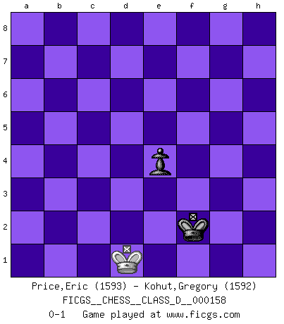 Last move : 0-1 2011 April 15 10:39:20 [Event "FICGS__CHESS__CLASS_D__000158"] [Site "FICGS"] [Date "2010.10.08"] [Round "1"] [White "Price,Eric"] [Black "Kohut,Gregory"] [Result "0-1"] [WhiteElo "1593"] [BlackElo "1592"] 1.e4 e6 2.d4 d5 3.Nc3 Bb4 4.e5 c5 5.a3 Bxc3+ 6.bxc3 Ne7 7.Qg4 O-O 8.Nf3 Nbc6 9.dxc5 Ng6 10.Qh5 Qa5 11.Bd2 Qxc5 12.Bd3 Bd7 13.Ng5 h6 14.Nf3 d4 15.Bxg6 fxg6 16.Qxg6 Nxe5 17.cxd4 Nxf3+ 18.gxf3 Qxd4 19.Rd1 Rxf3 20.O-O Rf6 21.Qxg7+ Kxg7 22.Bxh6+ Rxh6 23.Rxd4 Rg6+ 24.Kh1 Bc6+ 25.f3 Rf8 26.h4 Rxf3 27.Rxf3 Bxf3+ 28.Kh2 Bc6 29.c3 Rg2+ 30.Kh3 Ra2 31.Rg4+ Kh7 32.Rg3 Rxa3 33.Kg4 Ra2 34.Kf4 a5 35.Ke5 Bd5 36.Kd6 Rb2 37.Kc5 a4 38.Kd4 a3 39.c4 a2 40.Ra3 Bxc4 41.Kxc4 b5+ 42.Kc3 b4+ 43.Kxb2 bxa3+ 44.Kxa2 Kg6 45.Kxa3 Kh5 46.Kb2 Kxh4 47.Kc1 Kg4 48.Kc2 Kf3 49.Kd3 e5 50.Kd2 e4 51.Kd1 Kf2 0-1 French : Winawer, Advance, poisoned pawn variation Kingside Castling by player Black (move 7) Kingside Castling by player White (move 20) 10 pieces endgame at move 32 : White KRPP , Black KRBPPP WHITE : King + 1 Rook 2 Pawns BLACK : King + 1 Rook 1 Bishop 3 Pawns 9 pieces endgame at move 40 : White KRP , Black KRBPPP WHITE : King + 1 Rook 1 Pawn BLACK : King + 1 Rook 1 Bishop 3 Pawns 8 pieces endgame at move 41 : White KRP , Black KRPPP WHITE : King + 1 Rook 1 Pawn BLACK : King + 1 Rook 3 Pawns 7 pieces endgame at move 43 : White KRP , Black KPPP WHITE : King + 1 Rook 1 Pawn BLACK : King + 3 Pawns 6 pieces endgame at move 43 : White KP , Black KPPP WHITE : King + 1 Pawn BLACK : King + 3 Pawns 5 pieces endgame at move 44 : White KP , Black KPP WHITE : King + 1 Pawn BLACK : King + 2 Pawns 4 pieces endgame at move 45 : White KP , Black KP WHITE : King + 1 Pawn BLACK : King + 1 Pawn 3 pieces endgame at move 46 : White K , Black KP WHITE : King + BLACK : King + 1 Pawn Player Black won this chess game. Follow this game move after move (download)I love all positions. Give me a difficult positional game, I will play it. But totally won positions, I cannot stand them. (Hein Donner) Es ist wirklich schade, dass so viele Schachspieler nicht auf ihr Äußeres achten! (Alexandra Kosteniuk) Ser exitoso en el Ajedrez te permite descubrir tu propia personalidad. Eso es lo que deseo para los niños de mi clase. (Saudin Robovic) Les échecs c'est le défi de l'alpiniste, toujours plus haut, prêt à tout pour monter à l'assaut du Roi ennemi. Les échecs, c'est de la musique en mouvement, un ballet majestueux pour les yeux. C'est de la poésie composée par les fantômes du passé qui au même titre que Rimbaud ou Verlaine méritent notre admiration. Les échecs, c'est de la peinture ou le moindre mouvement modifie le tableau pour en faire un Picasso ou un Van Gogh. Les échecs, c'est tout et rien, c'est la vie et la mort. Jjulie33 sur le forum de France-Echecs. Computers are like Old Testament gods; lots of rules and no mercy. (Joseph Campbell)