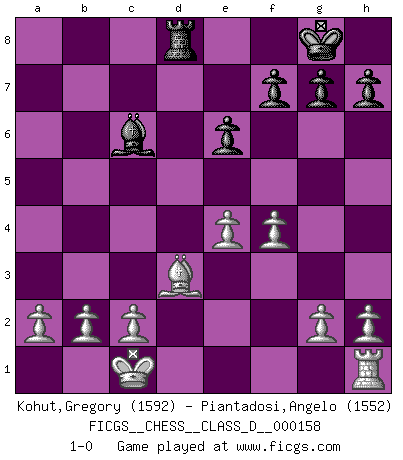 Last move : 1-0 2010 December 26 23:41:18 [Event "FICGS__CHESS__CLASS_D__000158"] [Site "FICGS"] [Date "2010.10.08"] [Round "1"] [White "Kohut,Gregory"] [Black "Piantadosi,Angelo"] [Result "1-0"] [WhiteElo "1592"] [BlackElo "1552"] 1.e4 c5 2.Nf3 Nc6 3.d4 cxd4 4.Nxd4 Nf6 5.Nc3 d6 6.Bg5 e6 7.Qd2 Be7 8.O-O-O O-O 9.f4 a6 10.Bxf6 Bxf6 11.Nxc6 bxc6 12.Qxd6 Qxd6 13.Rxd6 Rd8 14.Rxc6 Bxc3 15.Rxc3 Ra7 16.Rd3 Rad7 17.Rxd7 Bxd7 18.Bxa6 Bc6 19.Bd3 1-0 Sicilian defense Queenside Castling by player White (move 8) Kingside Castling by player Black (move 8) Player White won this chess game. Follow this game move after move (download)Chess is in its essence a game, in its form an art, and in its execution a science. (Baron Tassilo) Schach sollte überall auf der Welt Schulfach werden. Es fördert die geistige Auseinandersetzung. Es lehrt die Demut in der Niederlage. (Garry Kasparov) Todos los jugadores de Ajedrez deberían tener un pasatiempo. (Savielly Tartakower) 'L'échange des dames est un coup dur pour les deux adversaires...' Un journaliste lors d'une partie du match Spassky-Fischer A clear conscience is usually the sign of a bad memory. (Unknown)