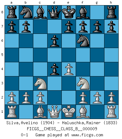 Last move : 0-1 2007 January 14 0:3:26 [Event "FICGS__CHESS__CLASS_B__000009"] [Site "FICGS"] [Date "2006.11.25"] [Round "1"] [White "Silva,Avelino"] [Black "Haluschka,Rainer"] [Result "0-1"] [WhiteElo "1904"] [BlackElo "1833"] 1.e4 c5 2.Nf3 d6 3.d4 Nf6 4.Nc3 cxd4 0-1 This chess game has been lost on time (started : 2006.11.25 17:11:6) Sicilian Player Black won this chess game. Follow this game move after move (download)In blitz, the Knight is stronger than the Bishop. (Vlastimil Hort) Ich spiele ehrlich und spiele, um zu gewinnen. Wenn ich verliere nehme ich meine Medizin. (Robert James Fischer) Fischer deseaba darle a los Rusos una sopa de su propia medicina. (Larry Evans) Le moment que je préfère le plus dans une rencontre, c'est celui où je sens que la personnalité de l'adversaire se brise. (Robert Fischer) The meaning of life is that it is to be lived, and it is not to be traded and conceptualized and squeezed into a pattern of systems. (Bruce Lee)