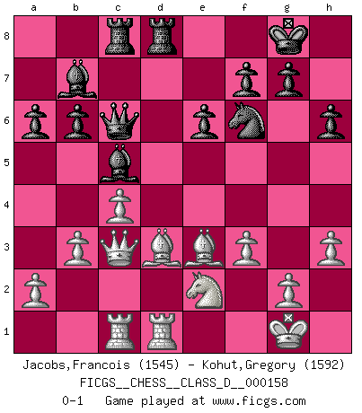 Last move : 0-1 2011 March 31 17:46:4 [Event "FICGS__CHESS__CLASS_D__000158"] [Site "FICGS"] [Date "2010.10.08"] [Round "1"] [White "Jacobs,Francois"] [Black "Kohut,Gregory"] [Result "0-1"] [WhiteElo "1545"] [BlackElo "1592"] 1.e4 e6 2.d4 d5 3.Nd2 c5 4.Ngf3 cxd4 5.exd5 Qxd5 6.Bc4 Qd6 7.O-O Nf6 8.Nb3 Nc6 9.Nbxd4 Nxd4 10.Nxd4 a6 11.Be3 Qc7 12.Bd3 Bd6 13.h3 O-O 14.c4 b6 15.Qc2 h6 16.Ne2 Bb7 17.Rac1 Rac8 18.Rfd1 Rfd8 19.Qc3 Be7 20.b3 Qc6 21.f3 Bc5 0-1 French : Tarrasch, Open variation Kingside Castling by player White (move 7) Kingside Castling by player Black (move 13) Player Black won this chess game. Follow this game move after move (download)Examine moves that smite! A good eye for smites is far more important than a knowledge of strategical principles. (Purdy) Privat ist Kortschnoi kein schlechter Mensch, sehr sympathisch. Aber während des Spiels ist er grausam. Er will dich töten. (Miguel Najdorf) ¡Examina movidas que hagan daño! Un buen ojo for movidas desvastantes es mucho mas importante que el conocimiento de principios estratégicos. (Purdy) Les échecs, c'est la lutte contre l'erreur. (Johannes Zukertort) Every now and then a man's mind is stretched by a new idea and never shrinks back to its former dimensions. (Oliver Wendell Holmes, Sr.)