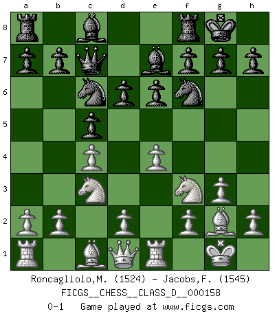 Last move : 0-1 2010 November 22 10:39:1 [Event "FICGS__CHESS__CLASS_D__000158"] [Site "FICGS"] [Date "2010.10.08"] [Round "1"] [White "Roncagliolo,Marco"] [Black "Jacobs,Francois"] [Result "0-1"] [WhiteElo "1524"] [BlackElo "1545"] 1.e4 c5 2.Nf3 e6 3.c4 Nc6 4.Nc3 Nf6 5.g3 Be7 6.Bg2 d6 7.O-O O-O 8.Re1 Qc7 0-1 This chess game has been lost on time (started : 2010.10.08 12:0:38) Sicilian defense Kingside Castling by player White (move 7) Kingside Castling by player Black (move 7) Player Black won this chess game. Follow this game move after move (download)Robert Fischer is a law unto himself. (Larry Evans) Wenn Schach ein enormer Dschungel ist, der seine Myriaden von Geheimnissen nicht preisgeben will, dann sind Computer die Kettensägen einer gewaltigen ökologisch unsensiblen Nutzholzfirma. (Nigel Short) Una buena ofensiva y una buena defensa, comienzan ambas con un buen desarrollo. (Bruce A. Moon) Les ravages du H expliquent la différence de niveau entre Tal et Thal [Abergel]. I'm extremely disappointed. I send you out for exciting, new designer drugs, you come back with tomato sauce. (Gregory House, House M.D.)