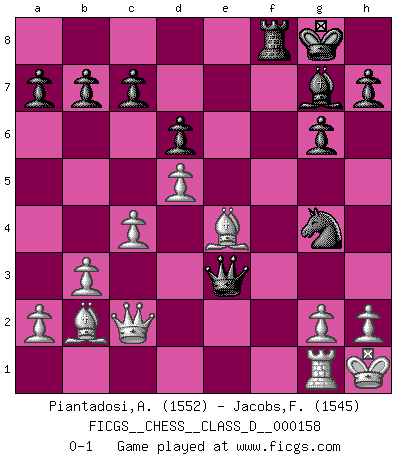 Last move : 0-1 2010 November 11 0:49:1 [Event "FICGS__CHESS__CLASS_D__000158"] [Site "FICGS"] [Date "2010.10.08"] [Round "1"] [White "Piantadosi,Angelo"] [Black "Jacobs,Francois"] [Result "0-1"] [WhiteElo "1552"] [BlackElo "1545"] 1.c4 e5 2.Nc3 Nf6 3.d3 Nc6 4.Nf3 d6 5.e3 Be7 6.Be2 O-O 7.O-O Be6 8.d4 exd4 9.exd4 Bg4 10.d5 Bxf3 11.Bxf3 Ne5 12.b3 Nfd7 13.Be4 Nc5 14.f4 Ned7 15.Bb2 Bf6 16.Bc2 g6 17.f5 Ne5 18.Ne4 Nxe4 19.Bxe4 Bg7 20.fxg6 fxg6 21.Qc2 Qg5 22.Rae1 Rxf1+ 23.Rxf1 Qe3+ 24.Kh1 Rf8 25.Rg1 Ng4 0-1 English Opening Kingside Castling by player Black (move 6) Kingside Castling by player White (move 7) Player Black won this chess game. Follow this game move after move (download)A thorough understanding of the typical mating continuations makes the most complicated sacrificial combinations leading up to them not only not difficult, but almost a matter of course. (Siegbert Tarrasch) Es hat in meinem Leben Zeiten gegeben, in denen das Schachspiel, wenn nicht zum Lebenszweck, so doch zu einem regelrechten Lebensersatz geworden ist. Man fühlt sich in solchen Zeiten nicht so, als besäße man eine göttliche Gabe, sondern eher so, als sei man von ihr besessen. (Garry Kasparov) Una compensación adecuada por un sacrificio es tener una combinación sólida que conduce a una posición ganadora; una compensación adecuada por una metida de pata es dejar a tu oponente arrebatar una derrota de las fauces de la victoria. (Bruce A. Moon) Le profane ne songe pas à la somme de jouissance dont il se prive, qui méconnaît ce jeu aux ressources aussi variées que passionnantes. (Jean-Marie Jeanton-Lamarche) A bird doesn't sing because it has an answer, it sings because it has a song. (Maya Angelou)