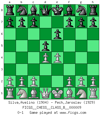 Last move : 0-1 2007 January 12 5:45:51 [Event "FICGS__CHESS__CLASS_B__000009"] [Site "FICGS"] [Date "2006.11.25"] [Round "1"] [White "Silva,Avelino"] [Black "Pech,Jaroslav"] [Result "0-1"] [WhiteElo "1904"] [BlackElo "1929"] 1.e4 e6 2.d4 d5 0-1 This chess game has been lost on time (started : 2006.11.25 17:11:6) French defense Player Black won this chess game. Follow this game move after move (download)Best by test: 1. e4 (Bobby Fischer) Oft bringt ein stiller Zug das Erdbeben. (Richard Reti) El Jaque al descubierto es el bombardero del tablero. (Reuben Fine) Les Echecs sont affaire de jugement sensible. Savoir quand frapper et quand esquiver. (Fischer) Panic is a sudden desertion of us, an a going over to the enemy of our imagination. (Christian Nevell Bovee)