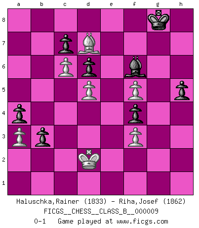 Last move : 0-1 2007 July 17 18:17:3 [Event "FICGS__CHESS__CLASS_B__000009"] [Site "FICGS"] [Date "2006.11.25"] [Round "1"] [White "Haluschka,Rainer"] [Black "Riha,Josef"] [Result "0-1"] [WhiteElo "1833"] [BlackElo "1862"] 1.d4 Nf6 2.c4 g6 3.Nc3 Bg7 4.e4 d6 5.Nf3 O-O 6.Be2 e5 7.d5 a5 8.Bg5 h6 9.Be3 Ng4 10.Bc1 f5 11.exf5 gxf5 12.O-O Bd7 13.h3 Nf6 14.Nh4 Ne4 15.Ng6 Nxc3 16.bxc3 Rf6 17.Bh5 f4 18.Re1 Na6 19.Nh4 Rf8 20.Ng6 Rf5 21.g4 Rg5 22.h4 Rxg6 23.Bxg6 Qxh4 24.Bh5 Qh3 25.f3 Qg3+ 26.Kh1 Nc5 27.Ba3 Na4 28.Rc1 e4 29.Rxe4 Nxc3 30.Rxc3 Bxc3 31.Qd3 Bg7 32.Bc1 b5 33.c5 Rf8 34.c6 Bc8 35.Re2 Bf5 36.gxf5 Qh4+ 37.Rh2 Qe1+ 38.Kg2 Qxc1 39.Bg6 Be5 40.Qf1 Qd2+ 41.Qf2 Qxf2+ 42.Kxf2 Kg7 43.Rg2 b4 44.Be8 Kh8 45.Bd7 a4 46.Ke2 b3 47.Kd3 Rg8 48.Rxg8+ Kxg8 49.a3 h5 50.Kd2 Bf6 0-1 King's Indian : Petrosian system, Stein variation Kingside Castling by player Black (move 5) Kingside Castling by player White (move 12) Player Black won this chess game. Follow this game move after move (download)The mistakes are there, waiting to be made. (Savielly Tartakower) Kein Schachspieler kann gut schlafen. (H. G. Wells) Los Peones son nacidos libres, y aún así, se encuentran por doquier encadenados. (Rick Kennedy) Les échecs, c'est la lutte contre l'erreur. (Johannes Zukertort) You cannot beat a roulette table unless you steal money from it. (Albert Einstein)