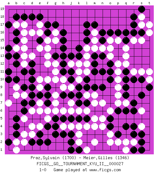 Last move : 1-0 2010 October 31 13:15:47 [Event "FICGS__GO__TOURNAMENT_KYU_II__000027"] [Site "FICGS"] [Date "2010.10.09"] [Round "1"] [Black "Praz,Sylvain"] [White "Meier,Gilles"] [Result "1-0"] [Rating 1 "1700"] [Rating 2 "1346"] 1.r16 d4 2.q4 d16 3.f17 c14 4.l17 o3 5.q6 q2 6.d18 c17 7.h16 n5 8.c6 f3 9.b4 c3 10.c9 b11 11.h3 k3 12.h5 q13 13.q10 o13 14.p16 r11 15.r10 s11 16.s10 s15 17.r3 r2 18.b3 b2 19.d2 c2 20.e3 e4 21.f2 d3 22.e2 e6 23.d7 e7 24.e8 g7 25.f8 g6 26.f4 f5 27.g4 c5 28.b5 d6 29.c7 s17 30.s16 t16 31.r17 s18 32.r18 r15 33.q15 q14 34.n16 j7 35.k5 l4 36.j2 k2 37.c18 b17 38.d11 a7 39.b10 c10 40.c11 b9 41.a10 c8 42.d9 n7 43.b13 c13 44.b12 p8 45.q8 p9 46.q9 n10 47.b15 b14 48.a14 c15 49.b16 c16 50.a13 c12 51.a11 f14 52.h14 f12 53.e15 e14 54.h12 g11 55.h11 g10 56.s2 g8 57.m13 e16 58.f16 f15 59.m11 k10 60.l5 m4 61.l7 k12 62.k13 l12 63.m12 l13 64.k14 l14 65.l15 m14 66.o12 p12 67.o11 p11 68.o10 p10 69.l9 m10 70.l10 l11 71.n9 m8 72.m9 l8 73.n13 n14 74.n11 p15 75.q16 m15 76.l16 o15 77.o16 h10 78.j11 j4 79.j5 h4 80.j3 k4 81.g5 g15 82.h15 s4 83.s3 m7 84.s19 t17 85.k1 l1 86.j1 m2 87.p3 p2 88.o4 s6 89.r4 n4 90.o5 t10 91.t9 t11 92.s8 l6 93.k9 j9 94.k7 k6 95.k8 j6 96.j10 k11 97.j8 h9 98.g13 f13 99.d12 d13 100.f7 f6 101.b18 e17 102.e18 q7 103.r7 p7 104.a17 g16 105.g17 j12 106.p6 o6 107.r6 e10 108.d10 e9 109.f9 f10 110.j13 g12 111.h13 b8 112.d8 m16 113.m17 m5 114.q11 q12 115.n15 o14 116.a2 b1 117.r1 q1 118.s1 o2 119.h8 h6 120.g3 1-0 Here are the names of the openings (joseki) played in the four corners : Corner d16 : d16 f17 Hoshi (Hwajeom, Seongjeom, Xingwei`) 4-4 Point. The star or hoshi (4-4) point, emphasizing influence at the potential expense of territory. Ikken Kakari (Hankan Keolch'im, Yi Gua`jiao~, 1-Space Low Approach). Black 2 is the standard approach move to the 4-4. Corner q4 : q4 o3 Hoshi (Hwajeom, Seongjeom, Xingwei`) 4-4 Point. The star or hoshi (4-4) point, emphasizing influence at the potential expense of territory. Ikken Kakari (Hankan Keolch'im, Yi Gua`jiao~, 1-Space Low Approach). White 2 is the standard approach move to the 4-4. Corner d4 : d4 c6 Hoshi (Hwajeom, Seongjeom, Xingwei`) 4-4 Point. The star or hoshi (4-4) point, emphasizing influence at the potential expense of territory. Ikken Kakari (Hankan Keolch'im, Yi Gua`jiao~, 1-Space Low Approach). Black 2 is the standard approach move to the 4-4. Player Black won this Go (weiqi, baduk) game. Follow this game move after move (download)A meijin needs no joseki. (Anonymous) Winning isn't everything... but losing is nothing. (Mednis)
