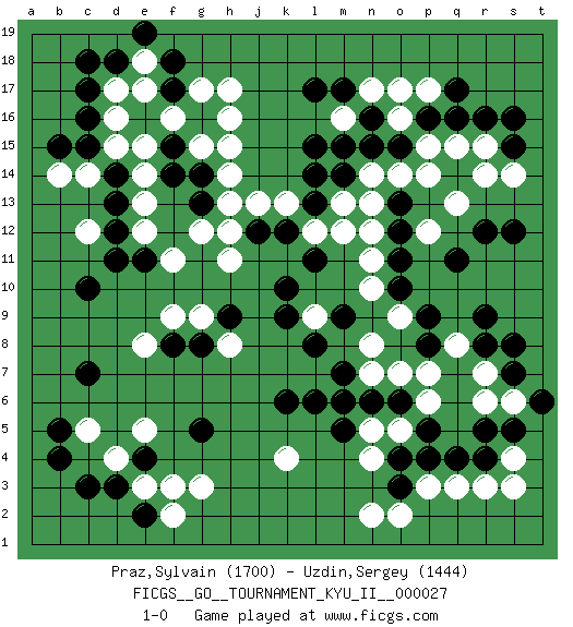 Last move : 1-0 2010 November 1 8:16:46 [Event "FICGS__GO__TOURNAMENT_KYU_II__000027"] [Site "FICGS"] [Date "2010.10.09"] [Round "1"] [Black "Praz,Sylvain"] [White "Uzdin,Sergey"] [Result "1-0"] [Rating 1 "1700"] [Rating 2 "1444"] 1.r16 d4 2.q4 d16 3.f17 c14 4.l17 h17 5.c17 d17 6.d18 e18 7.c18 e17 8.b15 b14 9.c15 d15 10.c16 e14 11.p16 r6 12.r9 r3 13.r4 q3 14.p4 s4 15.s5 s3 16.r5 o2 17.o3 p3 18.o4 n2 19.k10 k4 20.c7 c5 21.c10 g3 22.o10 n17 23.n16 m16 24.m17 o16 25.n15 o17 26.o15 p17 27.q17 p15 28.q16 p14 29.l15 r14 30.r12 p12 31.s15 n14 32.m14 o14 33.m15 m13 34.l13 m12 35.l11 q13 36.q11 s14 37.s12 r15 38.s16 q15 39.d13 c12 40.f18 h15 41.f15 h13 42.g16 h16 43.g14 h14 44.d14 e13 45.d12 e12 46.d11 e15 47.g13 g12 48.e19 h11 49.e11 f11 50.j12 h12 51.g8 p6 52.n6 f9 53.f8 g9 54.h9 g15 55.f14 f16 56.c3 g17 57.d3 e3 58.e2 f2 59.e4 f3 60.b4 e5 61.b5 e8 62.g5 h8 63.k6 q8 64.r8 s6 65.t6 n5 66.o6 o5 67.p5 p7 68.s7 n8 69.l8 n10 70.p9 m6 71.m5 n4 72.m7 n7 73.l6 o7 74.m6 o9 75.o11 n11 76.o12 n12 77.o13 n13 78.p8 r7 79.s8 l9 80.k9 l12 81.k12 k13 82.l14 j13 83.m9 1-0 Here are the names of the openings (joseki) played in the four corners : Corner d16 : d16 f17 Hoshi (Hwajeom, Seongjeom, Xingwei`) 4-4 Point. The star or hoshi (4-4) point, emphasizing influence at the potential expense of territory. Ikken Kakari (Hankan Keolch'im, Yi Gua`jiao~, 1-Space Low Approach). Black 2 is the standard approach move to the 4-4. Corner q4 : q4 r6 Hoshi (Hwajeom, Seongjeom, Xingwei`) 4-4 Point. The star or hoshi (4-4) point, emphasizing influence at the potential expense of territory. Ikken Kakari (Hankan Keolch'im, Yi Gua`jiao~, 1-Space Low Approach). White 2 is the standard approach move to the 4-4. Corner d4 : d4 c7 Hoshi (Hwajeom, Seongjeom, Xingwei`) 4-4 Point. The star or hoshi (4-4) point, emphasizing influence at the potential expense of territory. Niken Kakari (Dukan Keolch'im, E`r Gua`jiao~, 2-Space Low Approach). White typically answers by 7-3 or 3-5 (which is not joseki). Player Black won this Go (weiqi, baduk) game. Follow this game move after move (download)When your opponent is thick, you must also become thick. (Otake Hideo, 9p) Those who make the worst use of their time are the first to complain of its brevity. (Jean de la Bruyere)