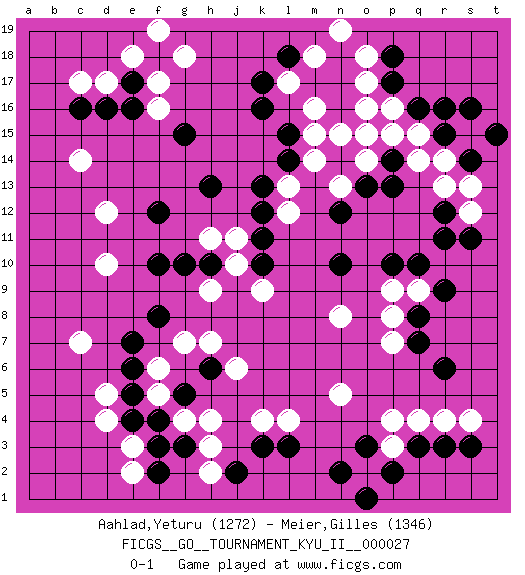 Last move : 0-1 2011 January 27 23:3:59 [Event "FICGS__GO__TOURNAMENT_KYU_II__000027"] [Site "FICGS"] [Date "2010.10.09"] [Round "1"] [Black "Aahlad,Yeturu"] [White "Meier,Gilles"] [Result "0-1"] [Rating 1 "1272"] [Rating 2 "1346"] 1.q16 d4 2.d16 q4 3.k16 k4 4.q10 d10 5.k10 c14 6.r6 c17 7.r3 r4 8.c16 d17 9.q3 p3 10.e17 e18 11.p2 o2 12.f18 f17 13.o3 p4 14.e16 g18 15.n2 f19 16.o1 n5 17.g15 n8 18.n10 o17 19.m17 o15 20.p17 o18 21.p18 q14 22.r15 r14 23.r12 s15 24.s16 q15 25.r16 p16 26.s14 s13 27.t15 s12 28.r11 r13 29.s11 m14 30.l14 m15 31.l15 l13 32.k13 l12 33.k12 g7 34.o13 o14 35.p13 n13 36.p14 p15 37.n16 n15 38.n12 m16 39.n17 l17 40.n18 n19 41.l18 o16 42.k17 m18 43.f3 e3 44.f4 h3 45.g5 j6 46.h6 h7 47.e5 d5 48.e7 f6 49.e6 c7 50.f8 h9 51.f10 h11 52.h10 j10 53.g10 j11 54.f12 d12 55.k11 k9 56.h13 f5 57.e4 e2 58.f2 g4 59.g3 h4 60.j2 h2 61.k3 l4 62.l3 p8 63.q8 p7 64.q7 p9 65.p10 q9 66.r9 s4 67.s3 f16 0-1 Here are the names of the openings (joseki) played in the four corners : Corner d16 : d16 c14 Hoshi (Hwajeom, Seongjeom, Xingwei`) 4-4 Point. The star or hoshi (4-4) point, emphasizing influence at the potential expense of territory. Ikken Kakari (Hankan Keolch'im, Yi Gua`jiao~, 1-Space Low Approach). White 2 is the standard approach move to the 4-4. Corner q4 : q4 r6 Hoshi (Hwajeom, Seongjeom, Xingwei`) 4-4 Point. The star or hoshi (4-4) point, emphasizing influence at the potential expense of territory. Ikken Kakari (Hankan Keolch'im, Yi Gua`jiao~, 1-Space Low Approach). Black 2 is the standard approach move to the 4-4. Corner q16 : q16 o17 Hoshi (Hwajeom, Seongjeom, Xingwei`) 4-4 Point. The star or hoshi (4-4) point, emphasizing influence at the potential expense of territory. Ikken Kakari (Hankan Keolch'im, Yi Gua`jiao~, 1-Space Low Approach). White 2 is the standard approach move to the 4-4. Player White won this Go (weiqi, baduk) game. Follow this game move after move (download)When your opponent is thick, you must also become thick. (Otake Hideo, 9p) Treat your password like your toothbrush. Don't let anybody else use it, and get a new one every six months. (Clifford Stoll)