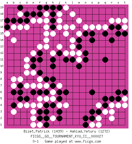 Last move : 0-1 2011 April 15 8:32:32 [Event "FICGS__GO__TOURNAMENT_KYU_II__000027"] [Site "FICGS"] [Date "2010.10.09"] [Round "1"] [Black "Bizet,Patrick"] [White "Aahlad,Yeturu"] [Result "0-1"] [Rating 1 "1439"] [Rating 2 "1272"] 1.q5 q3 2.p3 p2 3.q4 p4 4.o3 r3 5.o2 r4 6.r5 r2 7.o6 d16 8.q11 d4 9.h4 q16 10.n11 k16 11.h7 d10 12.h10 g13 13.j12 l13 14.l11 d7 15.r14 o16 16.o14 m15 17.c5 c4 18.d5 f4 19.e6 f7 20.f6 g5 21.g6 h5 22.j5 h6 23.j6 g7 24.g4 f5 25.f3 e4 26.h8 e7 27.j14 h15 28.j15 j16 29.h14 g14 30.c17 c16 31.d17 e17 32.e18 f17 33.f18 g17 34.f11 e12 35.e11 d11 36.s16 r17 37.h18 g18 38.g19 j18 39.h16 g15 40.h17 c18 41.d18 j17 42.b17 b16 43.a16 a15 44.a17 b14 45.j19 k19 46.h19 l18 47.c19 e2 48.f2 o1 49.n1 p1 50.n2 s17 51.r16 e3 52.f12 f13 53.q15 p16 54.n15 n16 55.m14 l14 56.l15 k15 57.m16 m17 58.b4 b3 59.b6 b7 60.k14 j13 61.h13 h12 62.k13 k12 63.m13 l12 64.k11 m12 65.n12 j13 66.h11 h2 67.g3 j4 68.j3 s4 69.s5 m11 70.m10 t16 71.t15 t17 72.s15 t5 73.t6 t4 74.s6 f1 75.g1 e1 76.g2 g16 77.f19 k4 78.j2 j7 79.k6 l16 80.e10 e9 81.c7 c8 82.c6 b8 83.f9 m15 84.o15 f8 85.g8 d9 0-1 Here are the names of the openings (joseki) played in the four corners : Corner q4 : q5 q3 Takamoku (Gomok, Gaomu`) 5-4 Point. The takamoku (high) point (5-4). With its emphasis on influence, the 5-4 point complements the 4-4 (hoshi) point in creating an influence-oriented fuseki. Komoku. Black responds with 3-3, 3-5, 4-6, 4-7, 3-6, 3-7. Corner d4 : d4 h4 Hoshi (Hwajeom, Seongjeom, Xingwei`) 4-4 Point. The star or hoshi (4-4) point, emphasizing influence at the potential expense of territory. Corner q16 : q11 q16 This joseki is unknown. A weak or weird move has probably been played in this corner. Player White won this Go (weiqi, baduk) game. Follow this game move after move (download)Conservative and slow will win. Believe it ! (Anonymous) Inventor: A person who makes an ingenious arrangement of wheels, levers and springs, and believes it civilization. (Ambrose Bierce, The Devil's Dictionary)