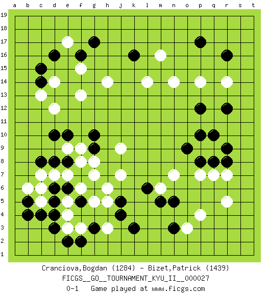 Last move : 0-1 2011 March 22 0:34:44 [Event "FICGS__GO__TOURNAMENT_KYU_II__000027"] [Site "FICGS"] [Date "2010.10.09"] [Round "1"] [Black "Cranciova,Bogdan"] [White "Bizet,Patrick"] [Result "0-1"] [Rating 1 "1284"] [Rating 2 "1439"] 1.r16 e4 2.d16 p4 3.c4 c5 4.d3 e3 5.b5 c6 6.k3 h3 7.n3 o3 8.n5 r5 9.p17 r14 10.r12 p14 11.p12 n14 12.r8 h6 13.j5 h5 14.j4 p9 15.q10 q9 16.r9 p7 17.k16 m16 18.d10 d12 19.c14 c13 20.c8 d14 21.c15 b6 22.b4 f13 23.g17 f15 24.f16 l14 25.g9 h14 26.p10 j7 27.o9 n7 28.l6 m6 29.m5 j9 30.f7 e9 31.e10 f9 32.g10 e7 33.e8 f8 34.d8 g8 35.e6 d7 36.d6 c7 37.d5 f6 38.f5 g7 39.d4 e5 40.e2 f3 41.f2 r7 42.p8 q7 43.q8 e17 44.g3 g5 0-1 This go game has been lost on time (started : 2010.10.09 15:40:58) Here are the names of the openings (joseki) played in the four corners : Corner d4 : e4 c4 Takamoku (Gomok, Gaomu`) 5-4 Point. The takamoku (high) point (5-4). With its emphasis on influence, the 5-4 point complements the 4-4 (hoshi) point in creating an influence-oriented fuseki. Komoku. White responds with 3-3, 3-5, 4-6, 4-7, 3-6, 3-7. Corner q4 : p4 n3 Takamoku (Gomok, Gaomu`) 5-4 Point. The takamoku (high) point (5-4). With its emphasis on influence, the 5-4 point complements the 4-4 (hoshi) point in creating an influence-oriented fuseki. Corner d16 : d16 d12 Hoshi (Hwajeom, Seongjeom, Xingwei`) 4-4 Point. The star or hoshi (4-4) point, emphasizing influence at the potential expense of territory. Player White won this Go (weiqi, baduk) game. Follow this game move after move (download)With less than 15 stones in danger, tenuki. (Anonymous) Secret operations are essential in war; upon them the army relies to make its every move. (Sun Tzu)