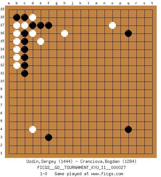 Last move : 1-0 2010 October 23 13:13:1 [Event "FICGS__GO__TOURNAMENT_KYU_II__000027 "] [Site "FICGS"] [Date "2010.10.09"] [Round "1"] [Black "Uzdin,Sergey "] [White "Cranciova,Bogdan "] [Result "1-0"] [Rating 1 "1444"] [Rating 2 "1284"] 1.q16 d4 2.q4 d16 3.f17 h16 4.d17 c17 5.c16 b16 6.c15 d18 7.e17 e15 8.f3 b15 9.c14 b14 10.c18 b17 11.c13 o17 12.b18 b13 13.c12 b12 14.c11 1-0 Here are the names of the openings (joseki) played in the four corners : Corner d16 : d16 f17Hoshi (Hwajeom, Seongjeom, Xingwei`) 4-4 Point. The star or hoshi (4-4) point, emphasizing influence at the potential expense of territory.Ikken Kakari (Hankan Keolch'im, Yi Gua`jiao~, 1-Space Low Approach). Black 2 is the standard approach move to the 4-4. Corner d4 : d4 f3Hoshi (Hwajeom, Seongjeom, Xingwei`) 4-4 Point. The star or hoshi (4-4) point, emphasizing influence at the potential expense of territory.Ikken Kakari (Hankan Keolch'im, Yi Gua`jiao~, 1-Space Low Approach). Black 2 is the standard approach move to the 4-4. Corner q16 : q16 o17Hoshi (Hwajeom, Seongjeom, Xingwei`) 4-4 Point. The star or hoshi (4-4) point, emphasizing influence at the potential expense of territory.Ikken Kakari (Hankan Keolch'im, Yi Gua`jiao~, 1-Space Low Approach). White 2 is the standard approach move to the 4-4. Player Black won this Go (weiqi, baduk) game.Follow this game move after move (download ) If you don't know ladders, don't play go. (Anonymous) Establishing goals is all right if you don't let them deprive you of interesting detours. (Doug Larson)