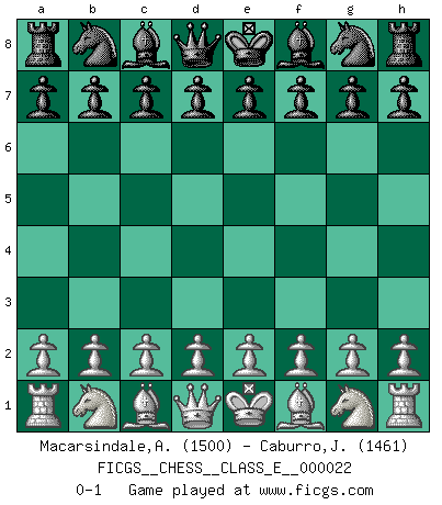 Last move : 0-1 2007 January 25 1:1:8 [Event "FICGS__CHESS__CLASS_E__000022"] [Site "FICGS"] [Date "2006.11.25"] [Round "1"] [White "Macarsindale,Arthur Alfred"] [Black "Caburro,John"] [Result "0-1"] [WhiteElo "1500"] [BlackElo "1461"] 0-1 Player Black won this chess game. Follow this game move after move (download)Do you realize Fischer almost never has any bad pieces? He exchanges them, and the bad pieces remain with his opponents. (Yuri Balashov) Obwohl ich alt bin, darf mir niemand den Finger in den Mund stecken, sonst beisse ich. (Wilhelm Steinitz) Nunca antes ha habido un jugador de Ajedrez con tal conocimiento a fondo de las complejidades del juego y una inmensa voluntad absolutamente indomable de ganar. Yo pienso que Fischer es el jugador mas grande que jamás haya existido. (Lisa Lane) Les Cavaliers se révèlent fort utiles dans les positions fermées. D'habitude, les Fous sont un peu plus forts que les Cavaliers dans les positions ouvertes. Qu'on le veuille ou non, il restera toujours des exceptions ! You lose, general Kenobi. (General Grievous in Star Wars ep.3)