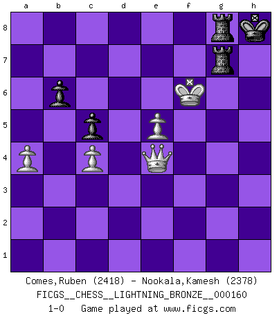 Last move : 1-0 2010 October 9 20:31:49 [Event "FICGS__CHESS__LIGHTNING_BRONZE__000160"] [Site "FICGS"] [Date "2010.10.09"] [Round "1"] [White "Comes,Ruben"] [Black "Nookala,Kamesh"] [Result "1-0"] [WhiteElo "2418"] [BlackElo "2378"] 1.e4 c5 2.Nf3 d6 3.Bb5+ Bd7 4.c4 Nc6 5.Nc3 e5 6.O-O Nf6 7.d3 h6 8.a3 a6 9.Ba4 Rb8 10.b4 b6 11.h3 Be7 12.Rb1 O-O 13.Bd2 Nd4 14.Bxd7 Qxd7 15.b5 axb5 16.Nxd4 cxd4 17.Nxb5 Rbe8 18.f4 Qc6 19.Rf2 Bd8 20.g4 Nd7 21.g5 hxg5 22.fxg5 g6 23.h4 Nc5 24.Qe2 Qd7 25.Kh2 Re6 26.Rbf1 Be7 27.Rf3 Kg7 28.Qf2 Bd8 29.Qg3 Rh8 30.Rxf7+ Qxf7 31.Rxf7+ Kxf7 32.Bb4 Ke7 33.Bxc5 dxc5 34.Qf2 Rf8 35.Qc2 Kf7 36.Qa4 Re7 37.Nd6+ Kg8 38.Qc6 Kh7 39.a4 Rc7 40.Qd5 Rg7 41.Qxe5 Bc7 42.Qd5 Bxd6+ 43.Qxd6 Rf2+ 44.Kg3 Rd2 45.h5 Rxd3+ 46.Kh4 Re3 47.hxg6+ Rxg6 48.Qf4 Kg8 49.Qe5 Rg7 50.Qe6+ Kf8 51.Qd6+ Kg8 52.e5 Re4+ 53.Kh5 Re2 54.Qe6+ Kh8 55.Qe8+ Rg8 56.Qc6 Rh2+ 57.Kg4 d3 58.Qf6+ Kh7 59.Qf5+ Kh8 60.Qxd3 Rg2+ 61.Kf5 R2xg5+ 62.Kf6 R5g7 63.Qe4 1-0 This chess game has been lost on time (started : 2010.10.09 18:46:54) Thibault de Vassal Good game! Ruben Comes Thank you very much! Sicilian : Canal-Sokolsky attack, 3...Bd7 Kingside Castling by player White (move 6) Kingside Castling by player Black (move 12) 10 pieces endgame at move 61 : White KQPPP , Black KRRPP WHITE : King + 1 Queen 3 Pawns BLACK : King + 2 Rooks 2 Pawns Player White won this chess game. Follow this game move after move (download)A great player and a great example for many. His book My 60 Memorable Games had a big impact on me. It is a shame he didn't continue to enrich the world of chess with his unparalleled understanding after 1972. (Jan Timman, about Bobby Fischer's death) Karpov ist ein Museumsstück. (Garry Kasparov) Una compensación adecuada por un sacrificio es tener una combinación sólida que conduce a una posición ganadora; una compensación adecuada por una metida de pata es dejar a tu oponente arrebatar una derrota de las fauces de la victoria. (Bruce A. Moon) On entre au jeu d'Echecs comme on entre en Religion. Pour le joueur d'Echecs, la partie d'Echecs c'est l'office, la messe, le défilé du 1er Mai, le dépôt de gerbe au Monument aux Morts. C'est un drame sacré. (Michel Roos) The leaves of memory seemed to make a mournful rustling in the dark. (Henry Wadsworth Longfellow)
