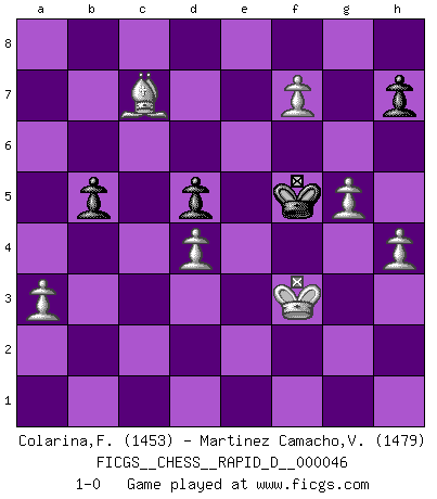 Last move : 1-0 2011 January 20 15:54:11 [Event "FICGS__CHESS__RAPID_D__000046"] [Site "FICGS"] [Date "2010.10.10"] [Round "1"] [White "Colarina,Floram"] [Black "Martinez Camacho,Victor Hugo"] [Result "1-0"] [WhiteElo "1453"] [BlackElo "1479"] 1.e4 c6 2.d4 d5 3.e5 Bf5 4.Bd3 Bxd3 5.Qxd3 Nd7 6.Ne2 e6 7.O-O Ne7 8.f4 Nf5 9.Ng3 Nxg3 10.Qxg3 c5 11.c3 Qb6 12.Qf2 Be7 13.b3 cxd4 14.cxd4 Rc8 15.f5 O-O 16.Be3 Rc6 17.g4 Rfc8 18.g5 Rc2 19.Nd2 Qd8 20.f6 Bf8 21.fxg7 Bxg7 22.Qxf7+ Kh8 23.Qxe6 Nf8 24.Qf7 R2c7 25.Qh5 Rc6 26.Nf3 Ng6 27.Nh4 Qe8 28.Nf5 a6 29.Nxg7 Kxg7 30.Qh6+ Kh8 31.Rf3 R8c7 32.Raf1 Qg8 33.Rf6 Rxf6 34.exf6 Rf7 35.Bf2 Qf8 36.Qxf8+ Nxf8 37.Re1 Kg8 38.Re5 Rd7 39.h4 Ng6 40.Re8+ Kf7 41.Rc8 Nf4 42.Kf1 Nd3 43.Bg3 Nb4 44.a3 Nd3 45.Ke2 Nb2 46.Rc2 Na4 47.bxa4 Kg6 48.Kf3 Kf5 49.Rc7 Rxc7 50.Bxc7 b5 51.axb5 axb5 52.f7 1-0 Caro-Kann : Advance variation Kingside Castling by player White (move 7) Kingside Castling by player Black (move 15) Player White won this chess game. Follow this game move after move (download)I had a toothache during the first game. In the second game I had a headache. In the third game it was an attack of rheumatism. In the fourth game, I wasn't feeling well. And in the fifth game? Well, must one have to win every game ? (Siegbert Tarrasch) Ich könnte leicht behaupten: Ja,ja, Leonid Breschnew wollte nicht, daß ich Weltmeister werde. In der Tat war die Sache komplizierter. (Viktor Kortschnoi) Debemos de asegurarnos de que el Ajedrez no se convierta en un lenguaje muerto, muy interesante, pero tan solo para un grupo muy pequeño. (Sytze Faber) Si le désir cupide (et stupide) de gagner est une inépuisable source de souffrance, une combinaison brillante sur l'échiquier est une découverte : le coquelicot qui s'épanouit lorsque apparaît la Voie Lactée. (Arrabal) Hold em is to stud what chess is to checkers. (Johnny Moss)