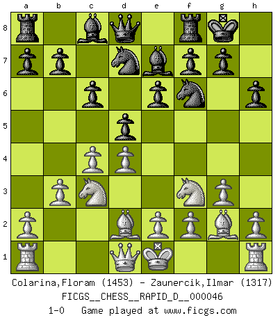 Last move : 1-0 2010 December 6 22:24:28 [Event "FICGS__CHESS__RAPID_D__000046"] [Site "FICGS"] [Date "2010.10.10"] [Round "1"] [White "Colarina,Floram"] [Black "Zaunercik,Ilmar"] [Result "1-0"] [WhiteElo "1453"] [BlackElo "1317"] 1.d4 d5 2.Nf3 e6 3.c4 Nf6 4.Nc3 c6 5.Bg5 Nbd7 6.g3 h6 7.Bd2 Be7 8.Bg2 O-O 9.b3 1-0 This chess game has been lost on time (started : 2010.10.10 2:16:58) Queen's pawn game Kingside Castling by player Black (move 8) Player White won this chess game. Follow this game move after move (download)Who is your opponent tonight, tonight I am playing against the Black pieces. (Akiba Rubinstein) Ich habe Putins Aufstieg an die Macht beobachtet und seine Politik, die demokratischen Institutionen meines Landes zu zerstören. (Garry Kasparov) Los finales de Peón son del Ajedrez lo que el cesped es del Golf. (Cecil Purdy) La vie est comme un jeu d'échecs : nous esquissons un plan, mais celui-ci est tributaire de ce que daignent faire l'adversaire aux échecs et le destin dans la vie. (Arthur Schopenhauer) Ah, beer! The cause of, and the solution to, all of life's problems. (Homer Simpson)