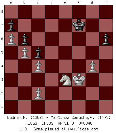 Last move : 1-0 2010 November 29 18:59:14 [Event "FICGS__CHESS__RAPID_D__000046"] [Site "FICGS"] [Date "2010.10.10"] [Round "1"] [White "Budnar,Milos"] [Black "Martinez Camacho,Victor Hugo"] [Result "1-0"] [WhiteElo "1382"] [BlackElo "1479"] 1.e4 e5 2.Nf3 Nc6 3.Bc4 Nf6 4.Ng5 d5 5.exd5 Na5 6.d3 Nxc4 7.dxc4 Bc5 8.Nc3 Ng4 9.Nge4 f5 10.Nxc5 c6 11.h3 Nf6 12.Bg5 O-O 13.Ne6 Bxe6 14.dxe6 Qe7 15.O-O Qxe6 16.Bxf6 Rxf6 17.Qe2 Re8 18.f4 e4 19.b4 b6 20.b5 c5 21.Nd5 Rf7 22.a4 Rb7 23.a5 h6 24.a6 Rf7 25.Rae1 Kf8 26.g4 fxg4 27.Qxg4 Qxg4+ 28.hxg4 Kg8 29.f5 e3 30.Rxe3 Rxe3 31.Nxe3 Kh7 32.Kg2 g6 33.fxg6 Kxg6 34.Rxf7 Kxf7 35.Kf3 1-0 Two knights defense : Kieseritsky variation Kingside Castling by player Black (move 12) Kingside Castling by player White (move 15) Player White won this chess game. Follow this game move after move (download)Chess, like any creative activity, can exist only through the combined efforts of those who have creative talent, and those who have the ability to organize their creative work. (Mikhail Botvinnik) Wir irren allesamt, nur jeder irrt anders. (Georg Christoph Lichtenberg) Prefiero perder una partida realmente buena, que ganar una mala. (David Levy) La guerre est enfant de la passion, la passion est enfant du narcissisme et le narcissisme est l'enfant. (...) Une autre partie ? (Thibault de Vassal) Man with more than one clock never knows what time it is. (Chinese thought)