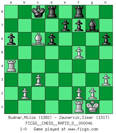 Last move : 1-0 2010 December 9 22:24:40 [Event "FICGS__CHESS__RAPID_D__000046"] [Site "FICGS"] [Date "2010.10.10"] [Round "1"] [White "Budnar,Milos"] [Black "Zaunercik,Ilmar"] [Result "1-0"] [WhiteElo "1382"] [BlackElo "1317"] 1.e4 c5 2.Nf3 d6 3.d4 cxd4 4.Nxd4 Nc6 5.Nc3 Nf6 6.Bb5 Bd7 7.Bg5 h6 8.Bxf6 gxf6 9.h3 a6 10.Ba4 b5 11.Bb3 Qb6 12.Nxc6 Bxc6 13.O-O Qc5 14.Nd5 O-O-O 15.a4 f5 16.exf5 Bxd5 17.Qxd5 Qxd5 18.Bxd5 Bg7 19.c3 Rhf8 20.Bc6 bxa4 21.Rxa4 1-0 This chess game has been lost on time (started : 2010.10.10 2:16:58) Sicilian Kingside Castling by player White (move 13) Queenside Castling by player Black (move 14) Player White won this chess game. Follow this game move after move (download)The blunders are all there on the board, waiting to be made. (Savielly Tartakover) Der zweitbeste Zug ist oft der einzig richtige. (Savielly Grigorievitsch Tartakower) El Ajedrez moderno está demasiado preocupado con cosas como la estructura de Peones. Olvidenlo, el Jaque Mate termina la partida. (Nigel Short) Le profane ne songe pas à la somme de jouissance dont il se prive, qui méconnaît ce jeu aux ressources aussi variées que passionnantes. (Jean-Marie Jeanton-Lamarche) I just play for fun. (Anna Kournikova)